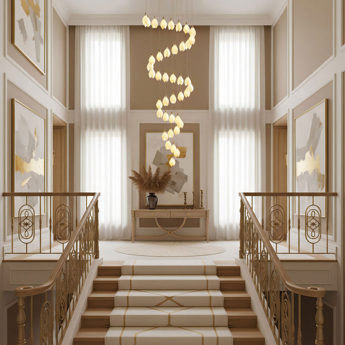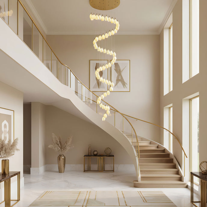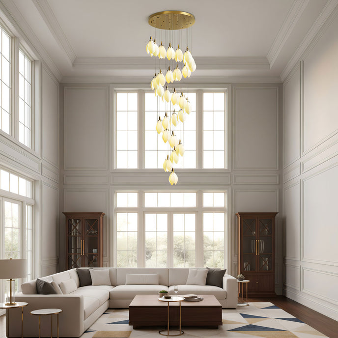 The Auralyn Chandelier by Mooijane captures celestial elegance with its layered composition of electroplated iron and fine ceramic. Inspired by blooming petals, each delicately suspended ceramic piece emits a soft, radiant glow, creating a tranquil and inviting ambiance. Accented with sleek golden tones, the tiered design brings both structure and softness to the space. Ideal for modern interiors, the Auralyn adds a sophisticated, nature-inspired statement to any room.