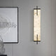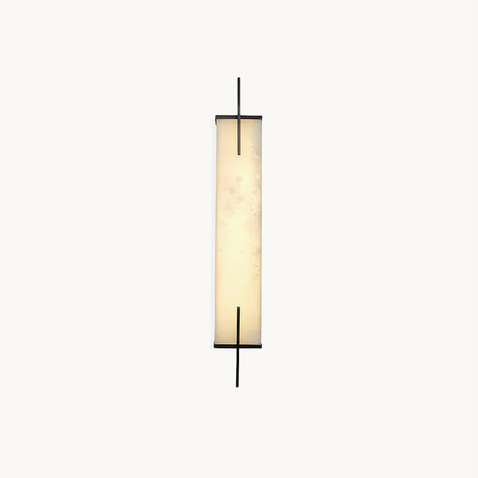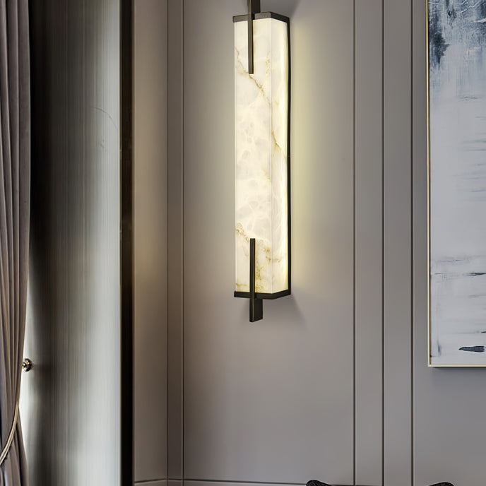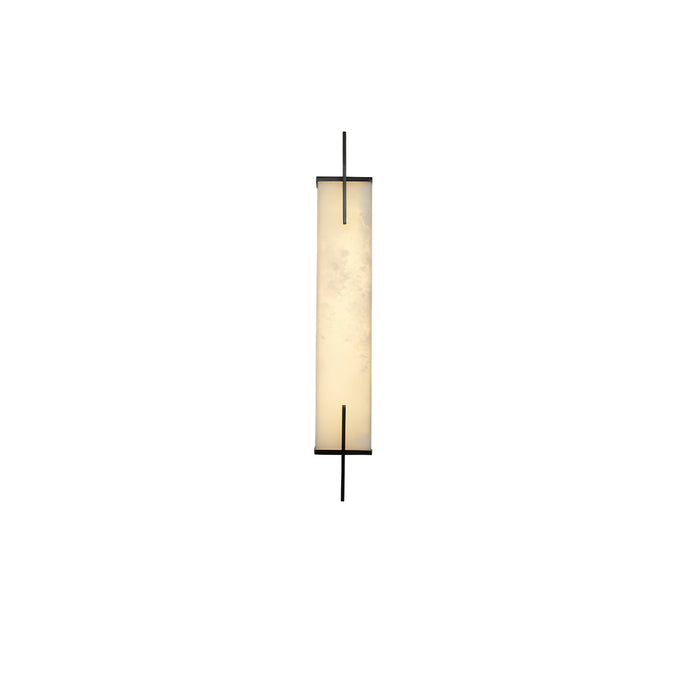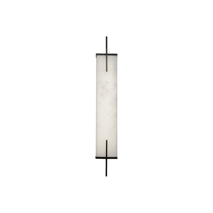 Prized for its extraordinary light diffusion effects, Spanish alabaster has long been used in place of windows in churches and in other applications where a sense of awe is desired. Calliope sets a stunning slab of Spanish alabaster on a cast copper backplate clasped into place with pieces of strong metal in brackets that accent the piece while breaking the frame.