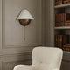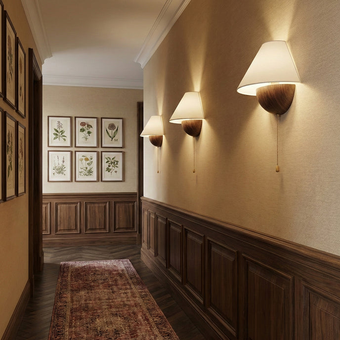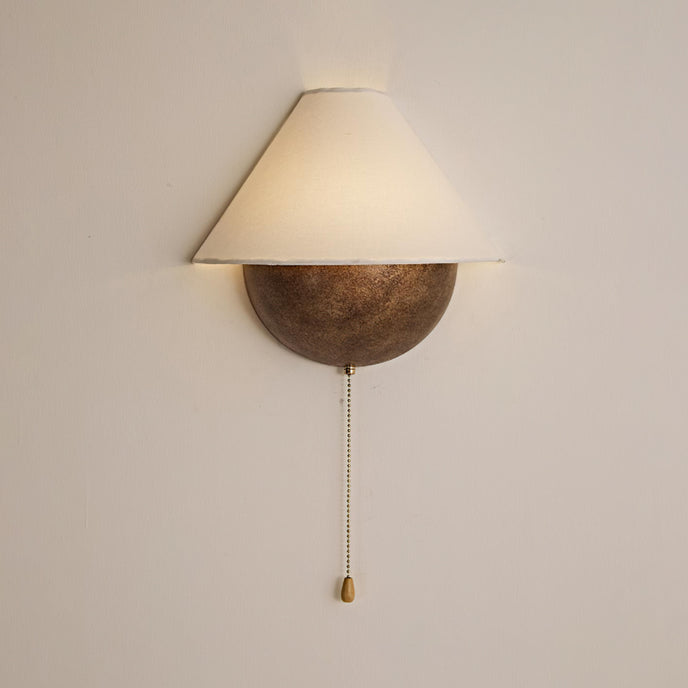 The Ellen Wall Lamp from Mooijane blends clean geometry with warm, inviting character. Its textured iron half-sphere base adds subtle handcrafted charm, while the tapered fabric shade diffuses light into a soft, ambient glow. A warm metallic pull-chain introduces a vintage touch and offers easy, intuitive control.
