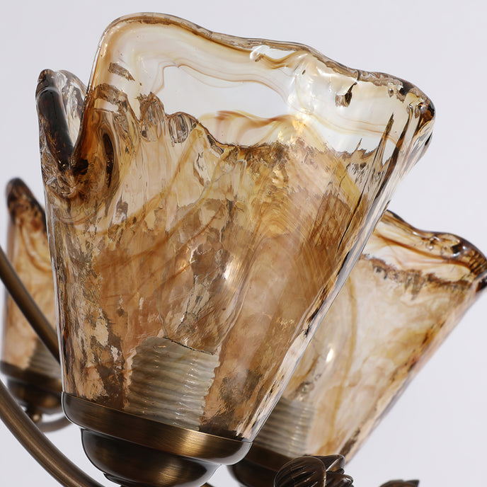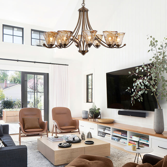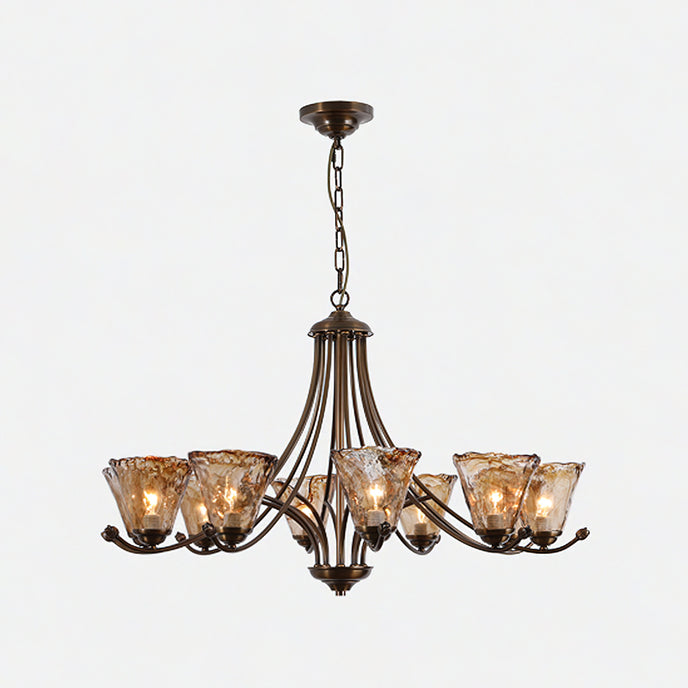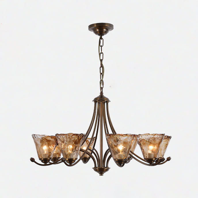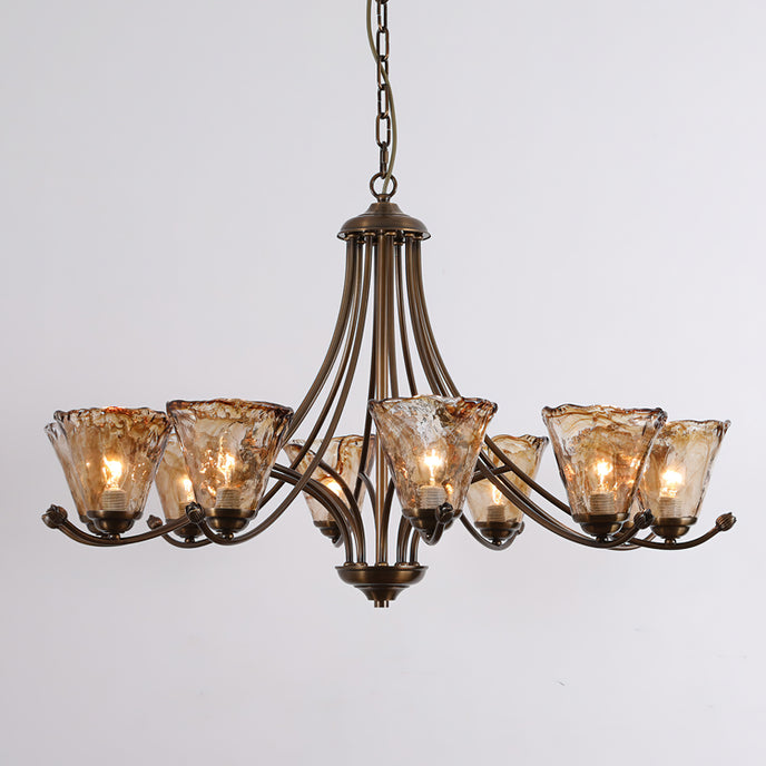 Mooijane presents the Franklin Chandelier, a perfect blend of contemporary creativity and classic design. The scroll arms feature a dark brass finish, exuding a timeless elegance. The handcrafted amber glass shade features a free-form design, adding a unique touch, and making it a valuable addition to any space.