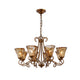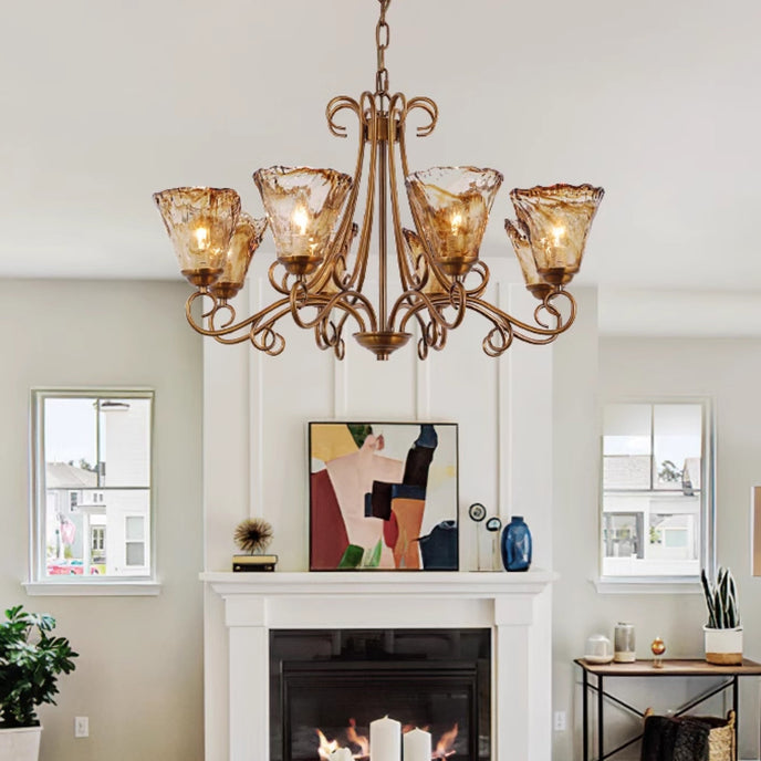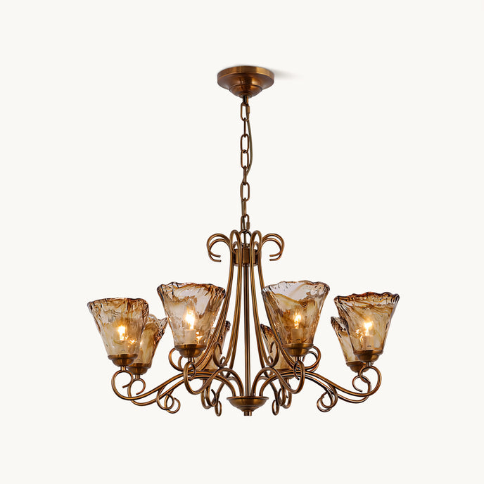 The Fratelli Chandelier by Mooijane blends classic elegance with refined artistry. Featuring gracefully curved metal arms in an antique brass finish, it exudes timeless sophistication. Each hand-blown amber glass shade is uniquely crafted, with natural ripples that create a soft, golden glow when illuminated. Ideal for dining rooms, living spaces, or traditional interiors, this chandelier brings warmth, romance, and vintage charm to any setting.