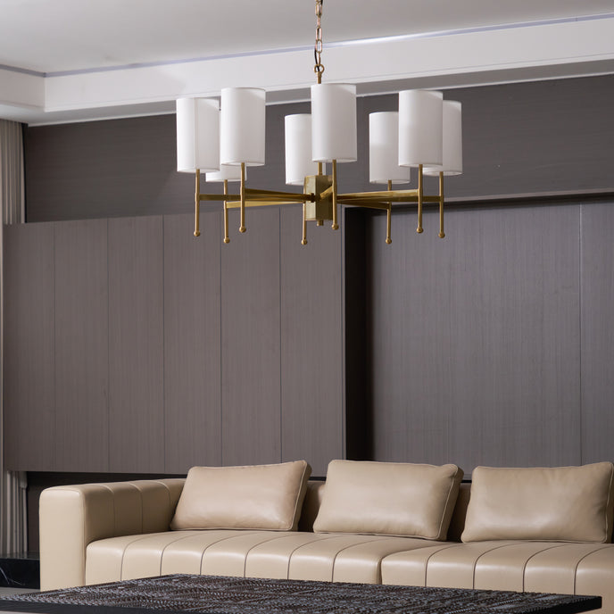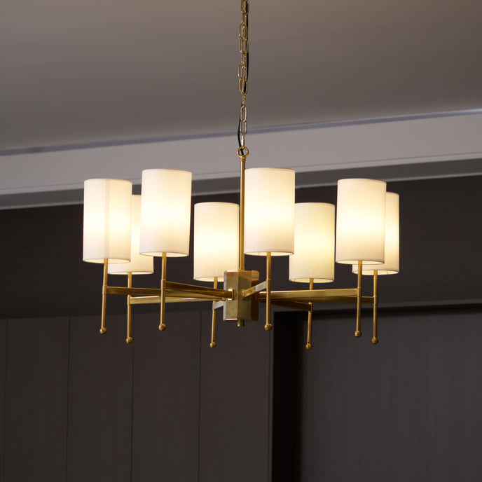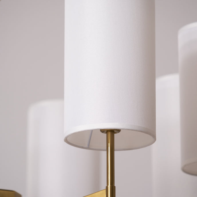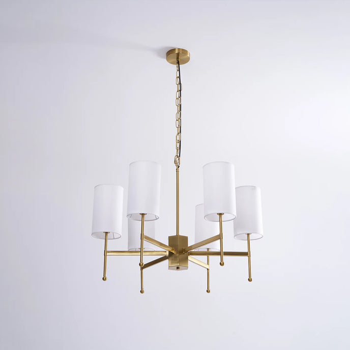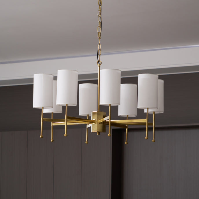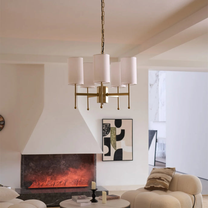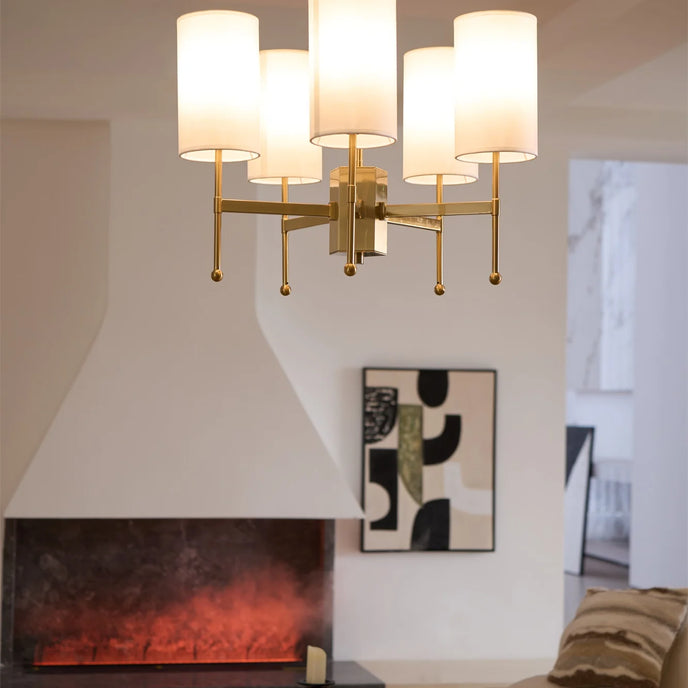 Enhance your space with the exclusive Kichler Chandelier from Mooijane. Its brass frame and fabric shade exude modern sophistication, while providing warm, inviting lighting for your living room, dining room or entryway. Experience the perfect blend of functionality and artistry with this luxurious centerpiece.