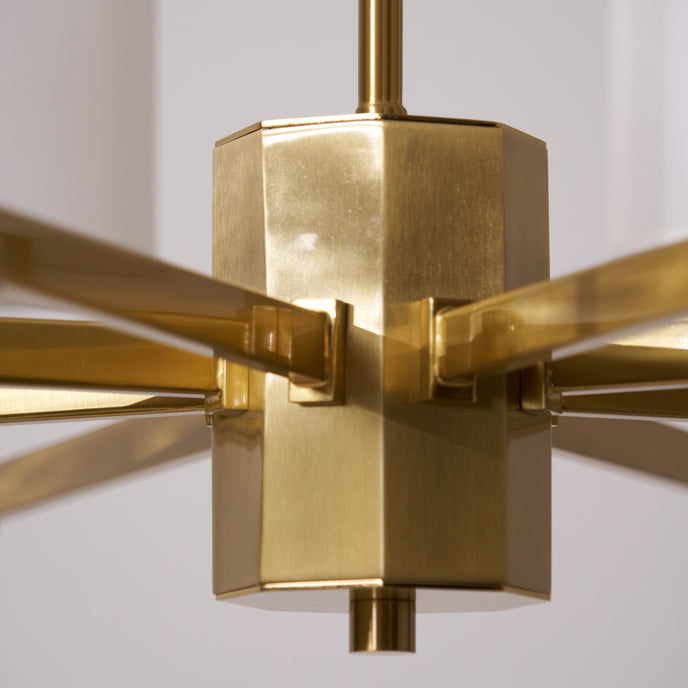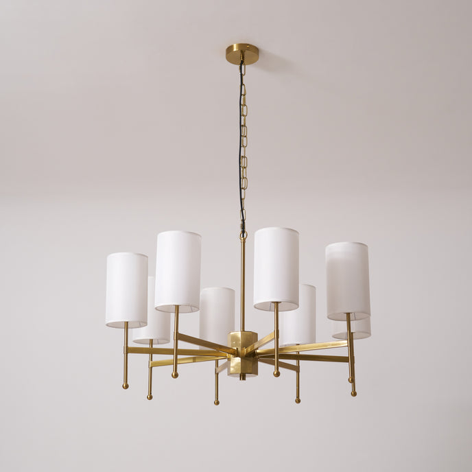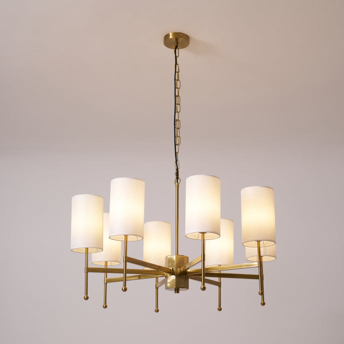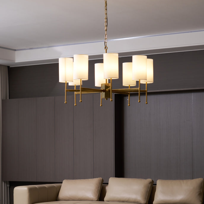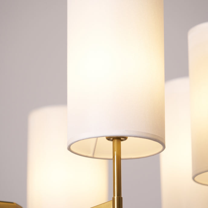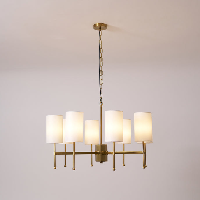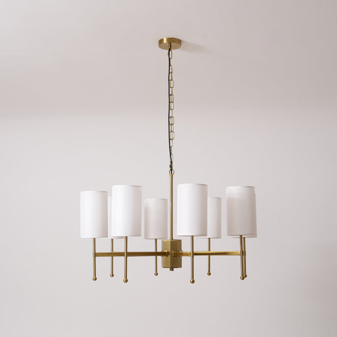 Enhance your space with the exclusive Kichler Chandelier from Mooijane. Its brass frame and fabric shade exude modern sophistication, while providing warm, inviting lighting for your living room, dining room or entryway. Experience the perfect blend of functionality and artistry with this luxurious centerpiece.