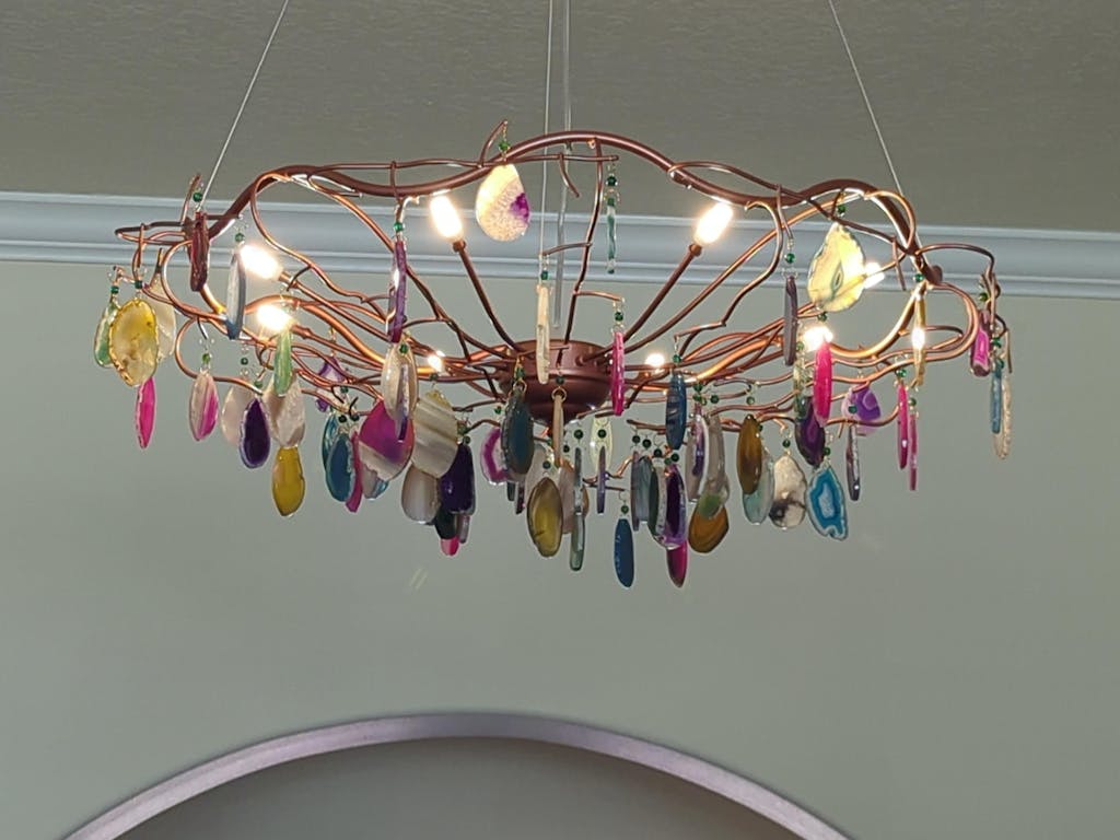 Dit is een luxe agaat kroonluchter. De natuurlijke ruwe agaat wordt gesneden, gepolijst, geperforeerd en gemaakt. De agaat is fel gekleurd en heeft een glad oppervlak. Het heeft een sterke lichttransmissie en geen verblinding.