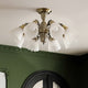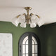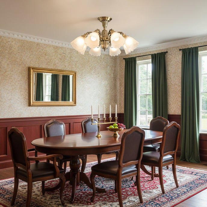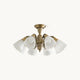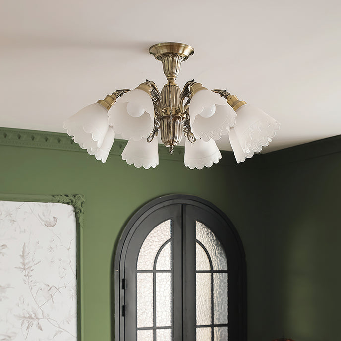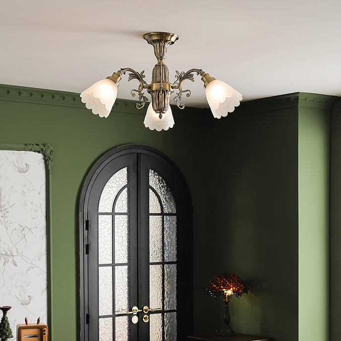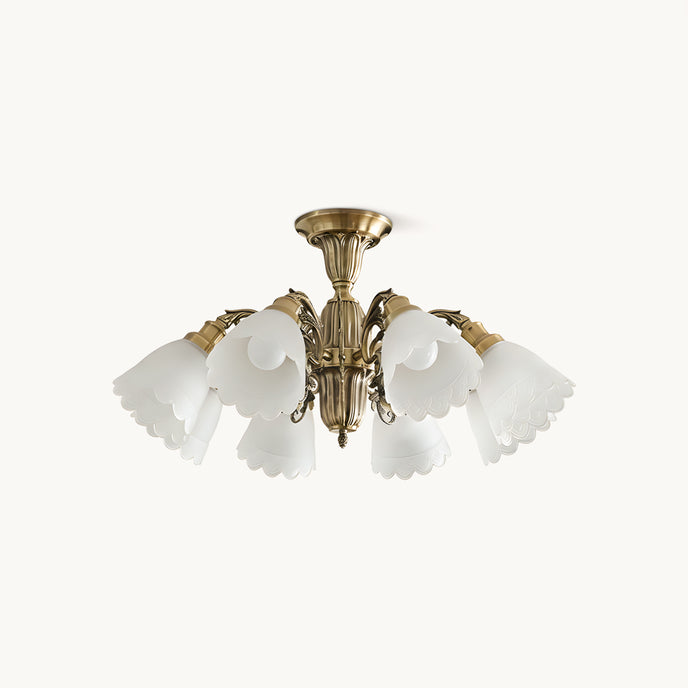 The Lyria Chandelier from Mooijane blends vintage-inspired sculptural ironwork with delicately crafted glass shades to create a piece that is both ornamental and quietly elegant. Flowing, carved-like iron contours bring classic refinement to the design, while each petal-shaped glass shade features subtle scalloped edges that add softness and charm. When illuminated, the frosted glass diffuses a warm, inviting glow that brightens the room with gentle radiance.