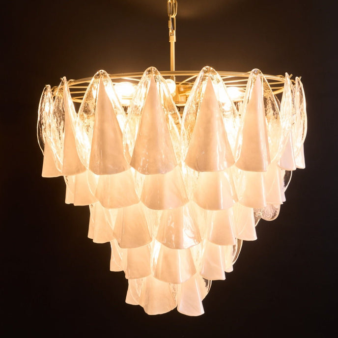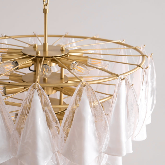 Indulge in the opulence of the Marrina Murano Glass Chandelier by Mooijane. Inspired by the reflections of moonlight, this hand-blown masterpiece features alternating opaque and white glass leaves on a delicate gold frame. Perfect for dining rooms and statement living spaces, the Marrina Chandelier adds a touch of bright elegance to your home.