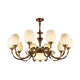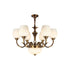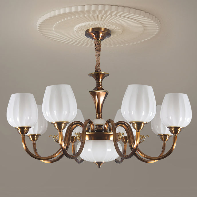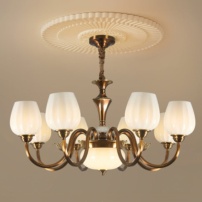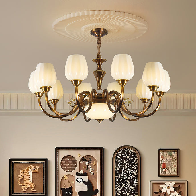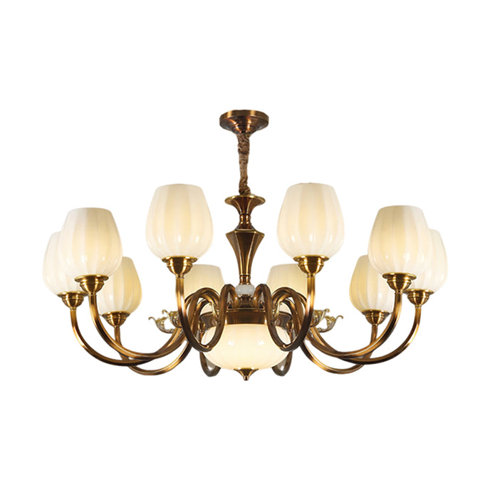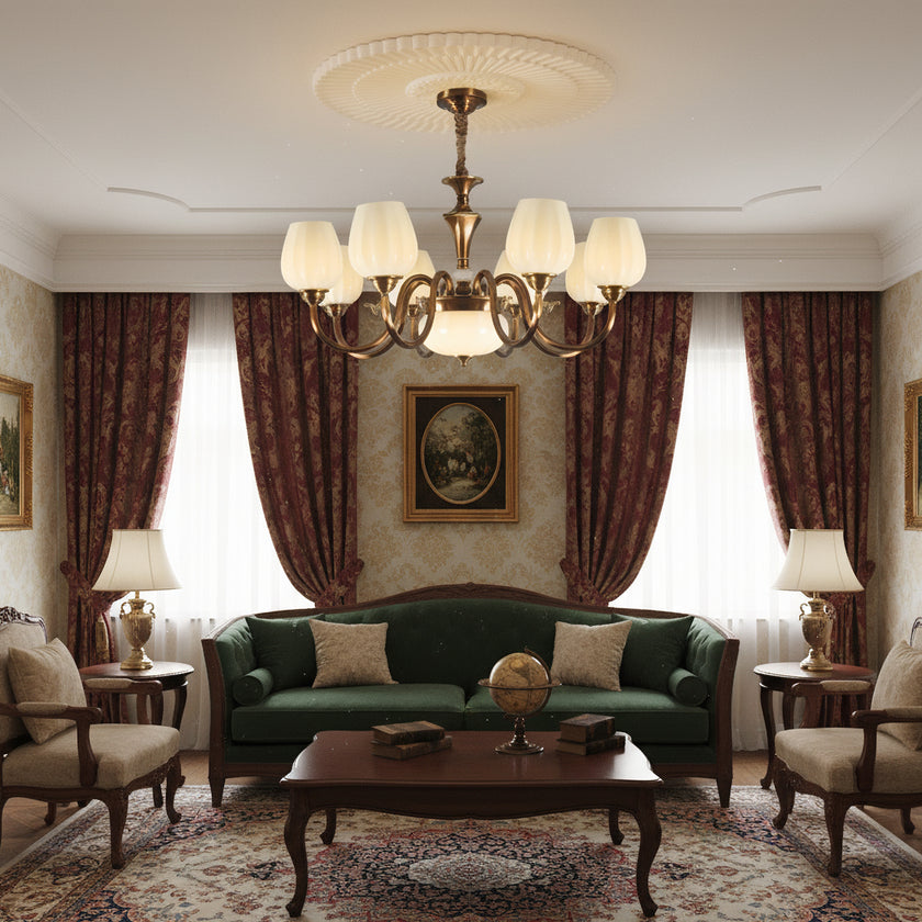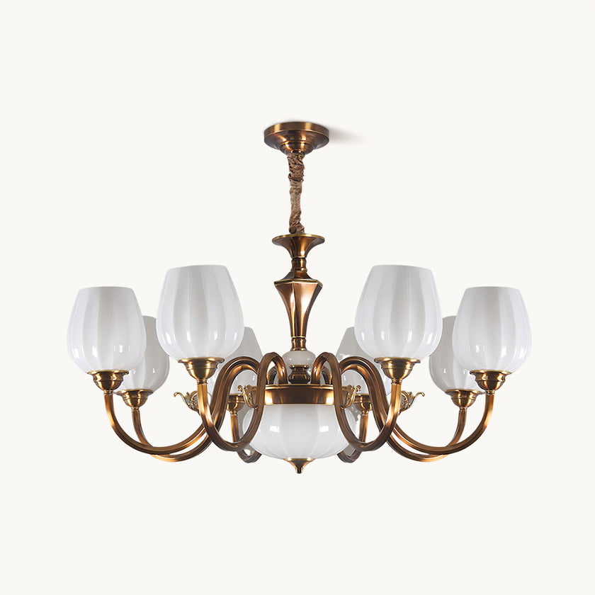 This Milanese chandelier, designed by Mooijane, blends classic elegance with vintage luxury. Curved bronze arms gracefully extend from a sculpted central column, supporting a floral, opaline glass shade that casts a warm, captivating glow. The contrast between the bronze and the soft glass highlights the exquisite craftsmanship, making it an ideal addition to any dining room, living room, or entryway. This timeless design brings balance, warmth, and sophistication to any interior.