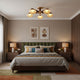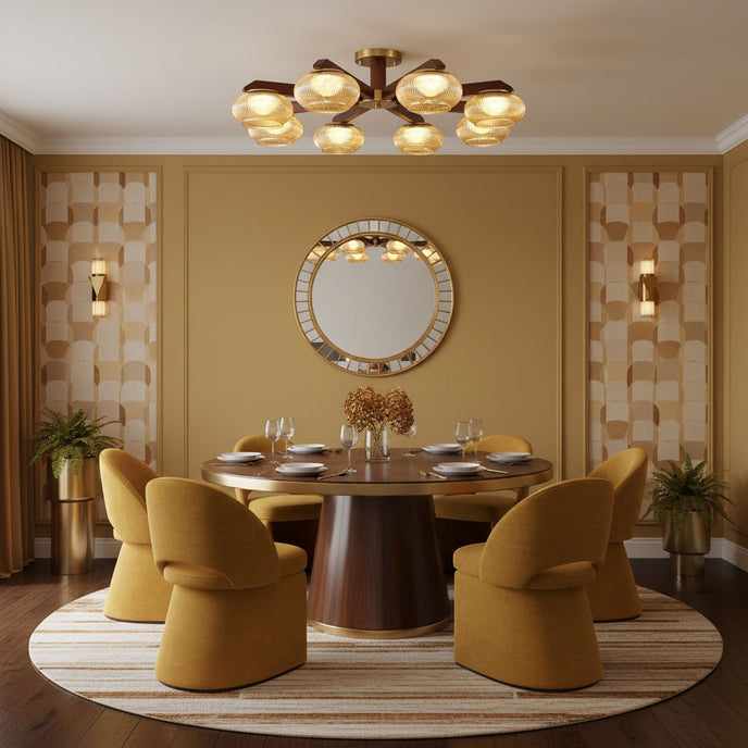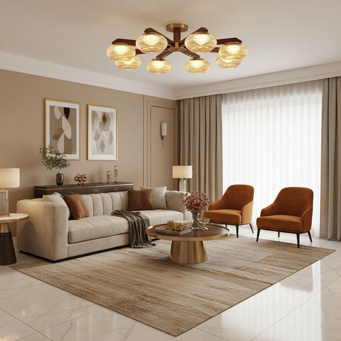 The Molari Ceiling Lamp from Mooijane showcases a refined radial design that merges natural materials with modern elegance. Solid wood arms extend symmetrically from a central metal core, creating a sculptural, balanced form. Each round glass shade features subtle vertical veining, casting a soft, even glow that warms any space. Perfect for living rooms, dining areas, or open interiors, Molari brings together style, functionality, and timeless appeal.