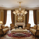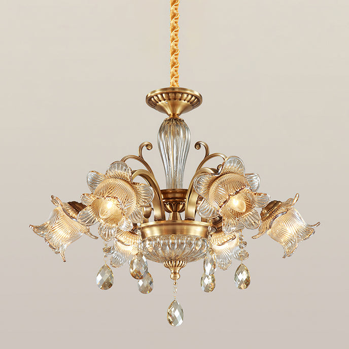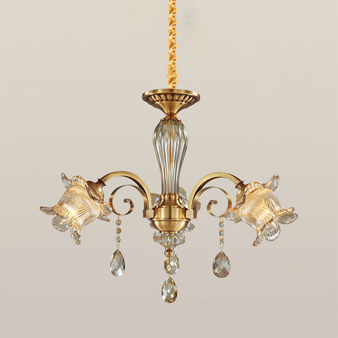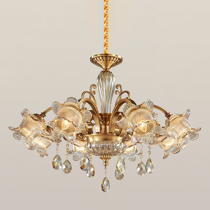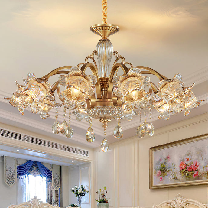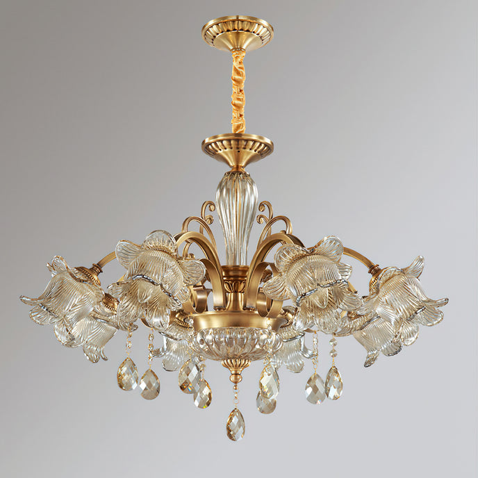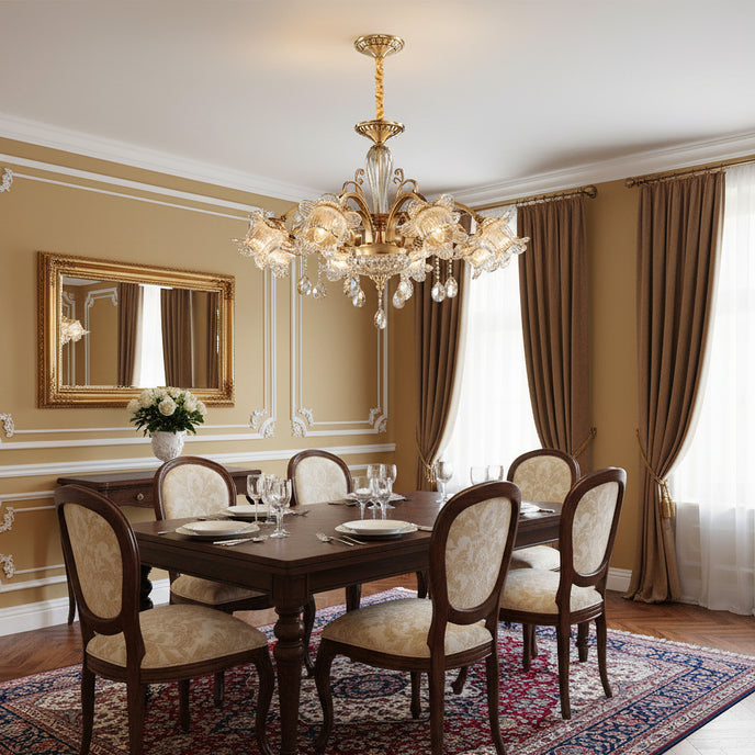 The Odile Chandelier by Mooijane radiates refined luxury and timeless elegance. Its floral-inspired design features delicately ribbed glass petals that shimmer with every reflection, while crystal droplets add a touch of sparkle and grace. The sculpted arms and golden finish evoke classic European artistry, creating a warm and opulent atmosphere. Perfect for living rooms, dining areas, or grand entryways, this chandelier transforms any space into a statement of sophistication and beauty.