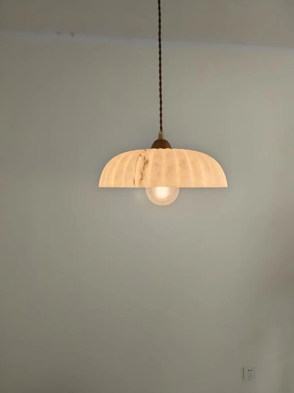 The shade is crafted from premium resin engineered to replicate the warm translucency and subtle veining of natural alabaster stone — glowing softly when lit.