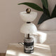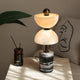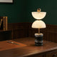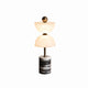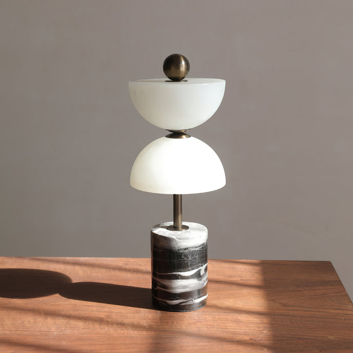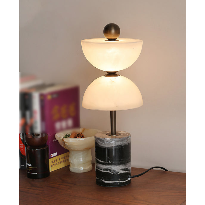 The Outela Table Lamp by Mooijane seamlessly blends modern design with natural materials. Its luxurious snowflake stone base, with its unique marbled texture, is paired with a sleek stainless steel stem, creating a striking visual presence. Above, two semi-circular alabaster glass shades provide a soft, balanced glow, enhancing the warmth of the stone base.