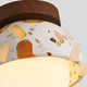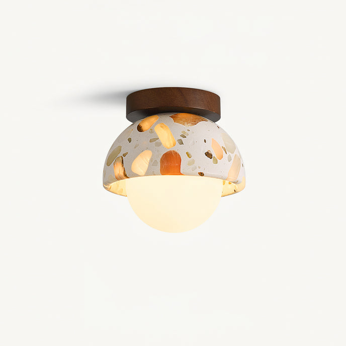 The Piedra Ceiling Light from Mooijane blends playful geometry with warm, organic materials for a modern yet handcrafted look. Its dome-shaped terrazzo shade—sprinkled with colorful stone chips—creates a softly textured glow when illuminated. A smooth wooden canopy adds natural warmth, while the matte glass globe diffuses light into a gentle, ambient radiance.
