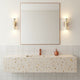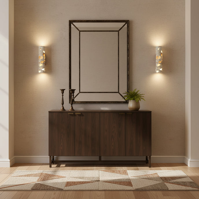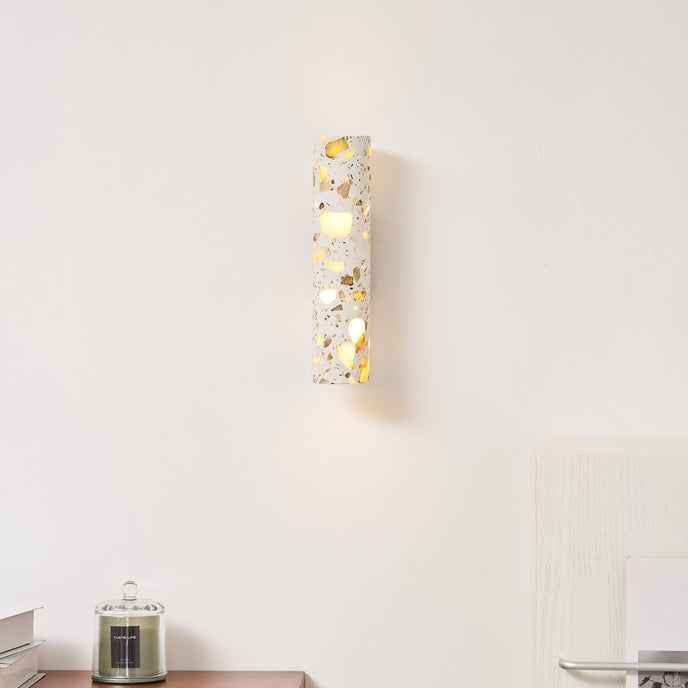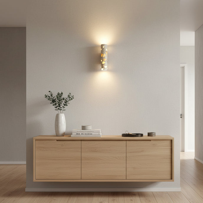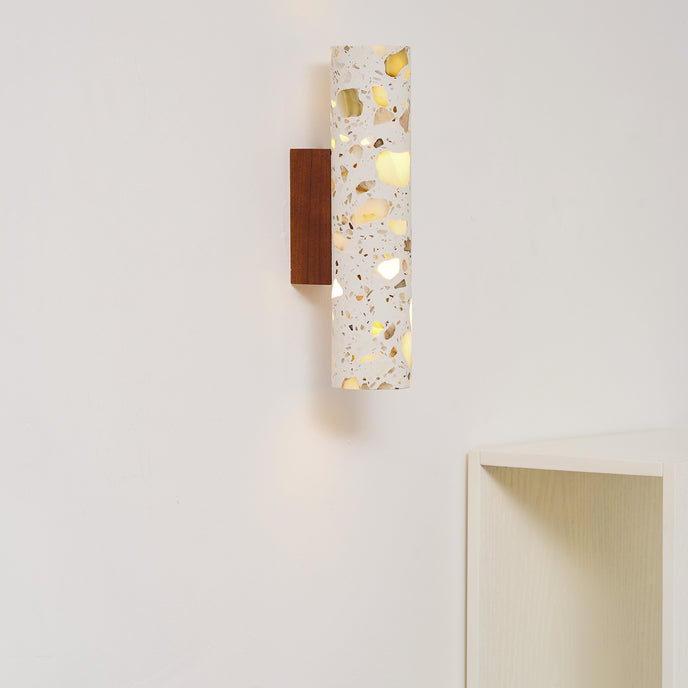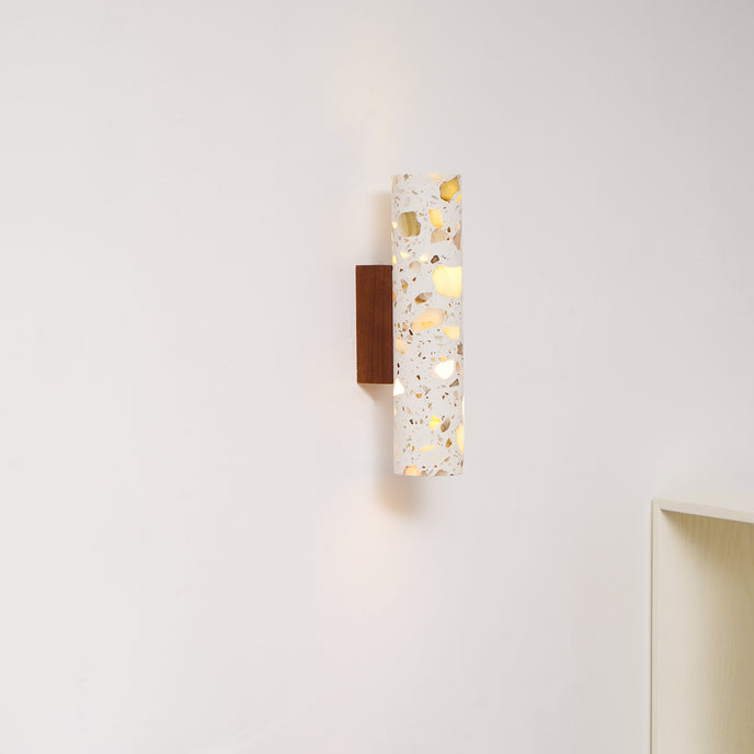 The Solis Column Wall Lamp from Mooijane blends timeless design with natural materials. Its cylindrical terrazzo shade, crafted from high-quality marble chips, features a unique, organic surface pattern that adds sophistication to any space. Complemented by a sturdy wood mounting base, the warm, earthy tones of the terrazzo contrast beautifully with the smoothness of the wood.