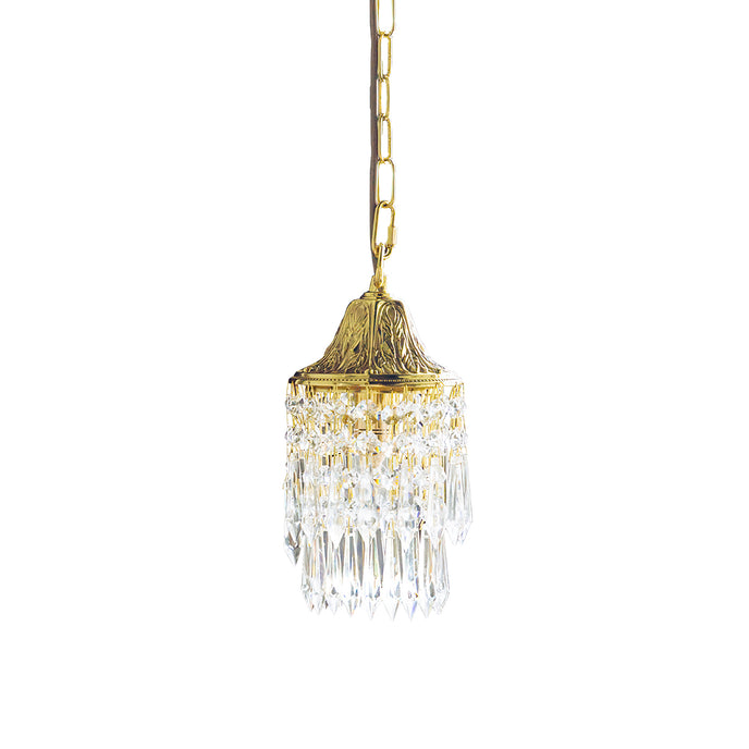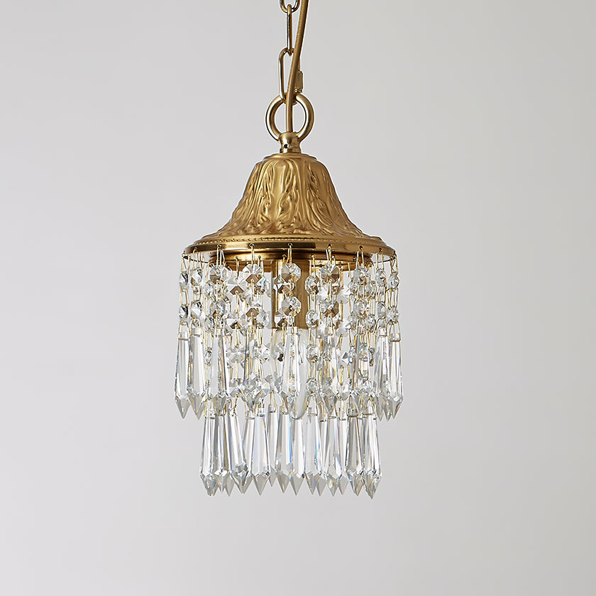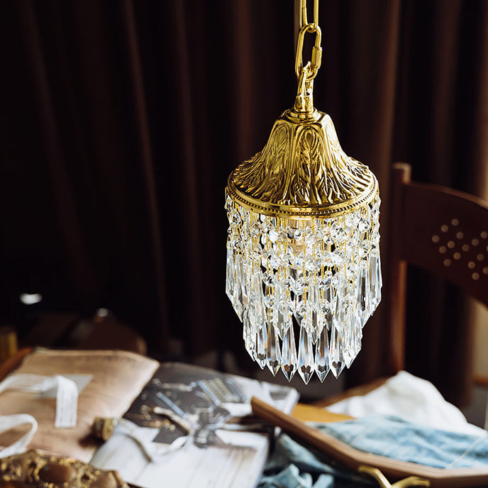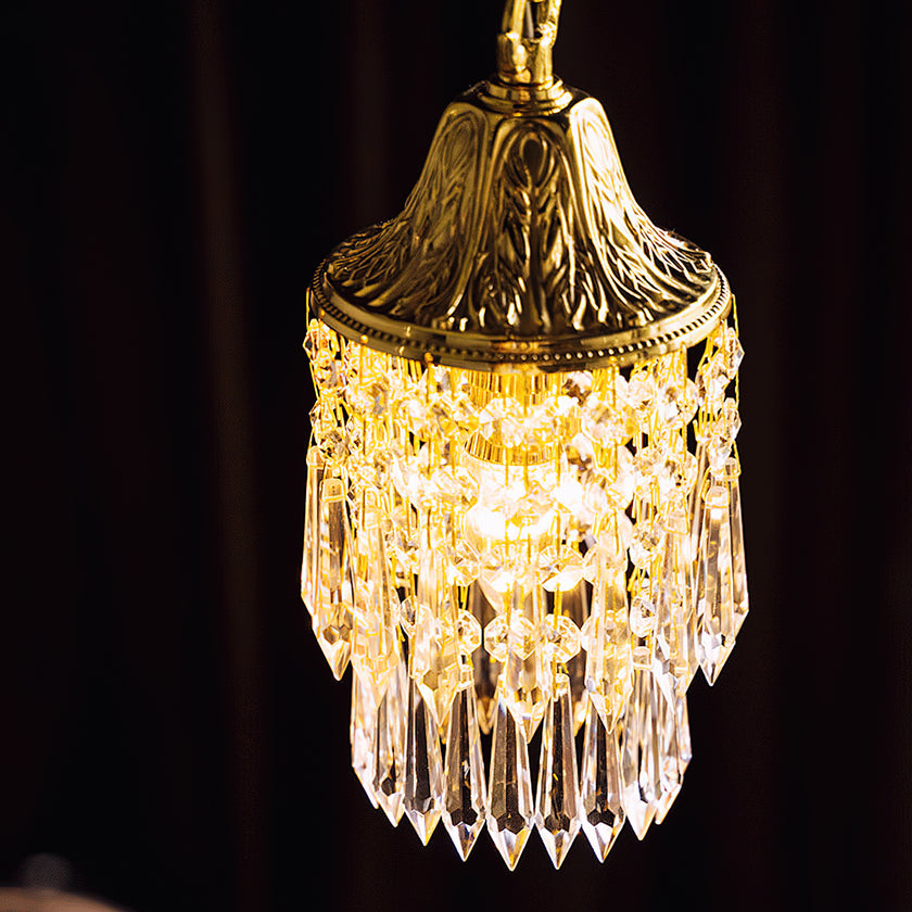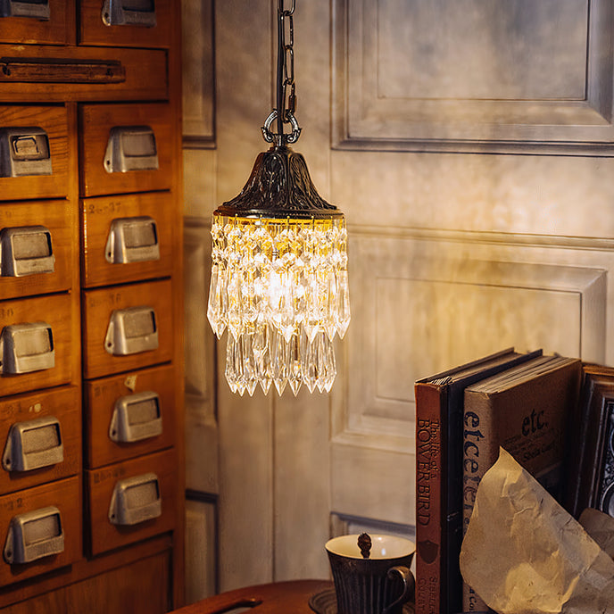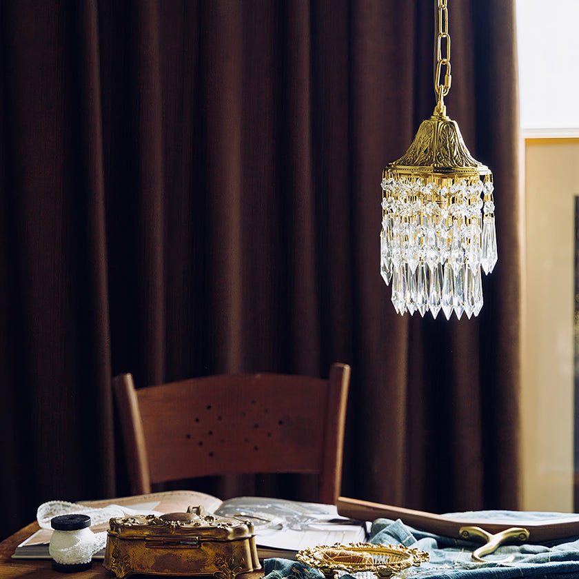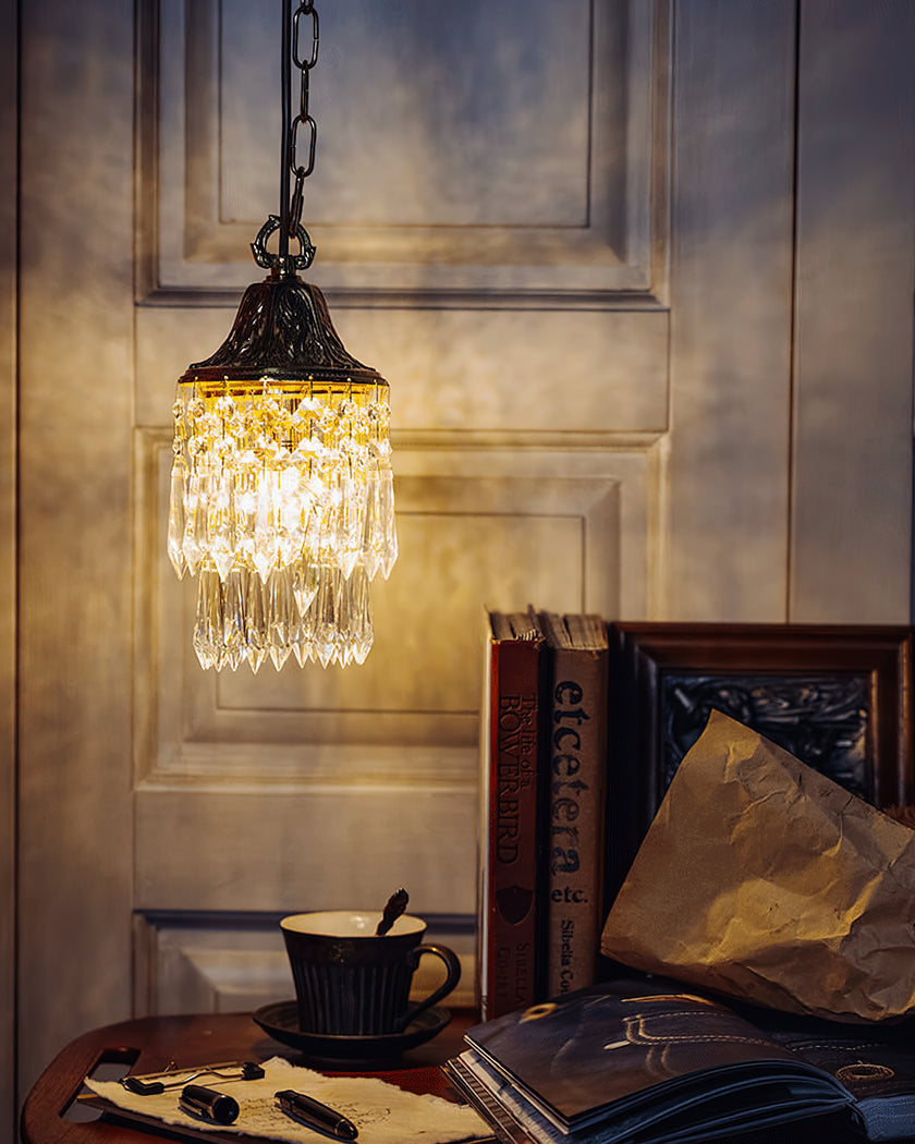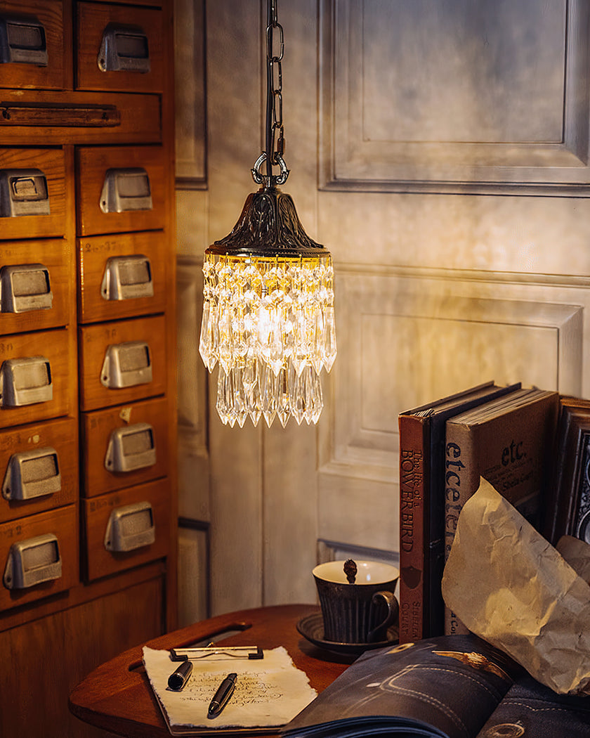 This Wind Chime Crystal Pendant Light from Mooijane is a great addition to any room. Made of metal, this chandelier features a vintage pattern embossed design, creating a classic nostalgic atmosphere. The lampshade is made of delicate crystal and has a wind-chime-like appearance that is sure to attract attention.