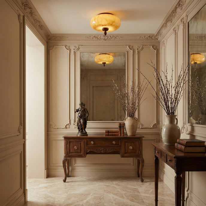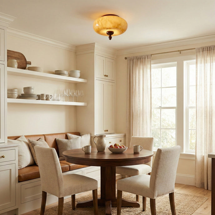 The Algonac Ceiling Light from Mooijane features a smooth, rounded glass shade accented with a refined wood detail for a warm, understated look. The gently curved glass diffuses light evenly, creating a soft, ambient glow. Ideal for bedrooms, hallways, or living areas, this flush mount brings calm elegance and timeless simplicity to any space.