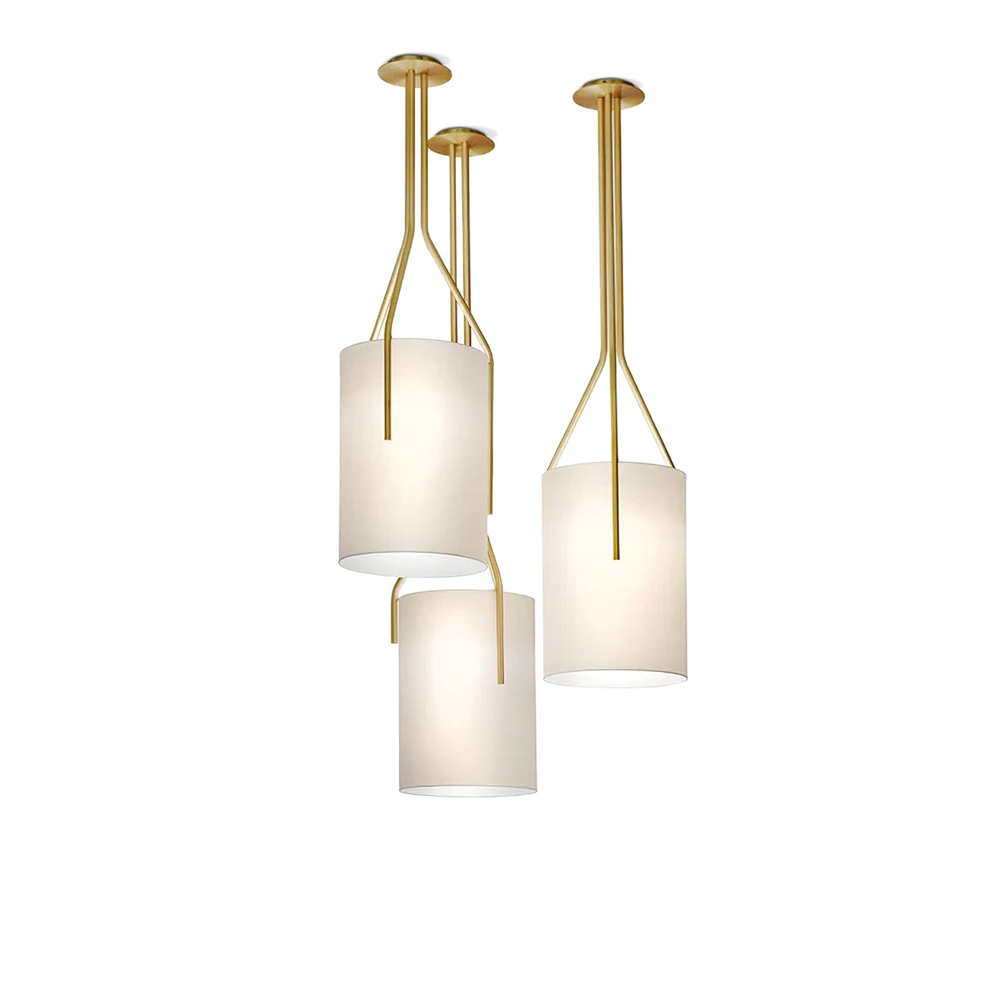 As the name suggests, this sleek chandelier lamp has a graceful tree-like form that supports its cylindrical paper-fiber shade. Open collection, Arborescence is a complete range that comes in different sizes. Scalable, you have the opportunity to focus on tailor-made. Custom height. LED and DALI version on request. The stylish and minimalist Arborescence chandelier lamp. The stylish and minimalist Arborescence features a white cloth hood, and satin or polished brass finish. There are three lengths to choose from.
