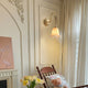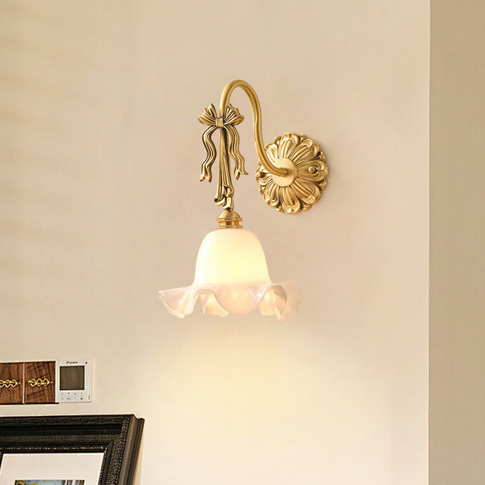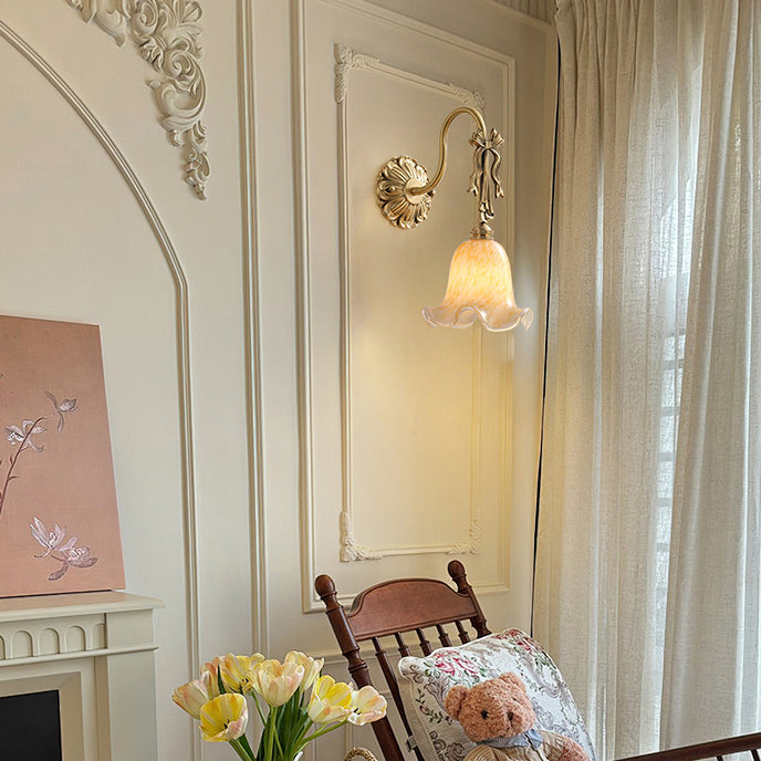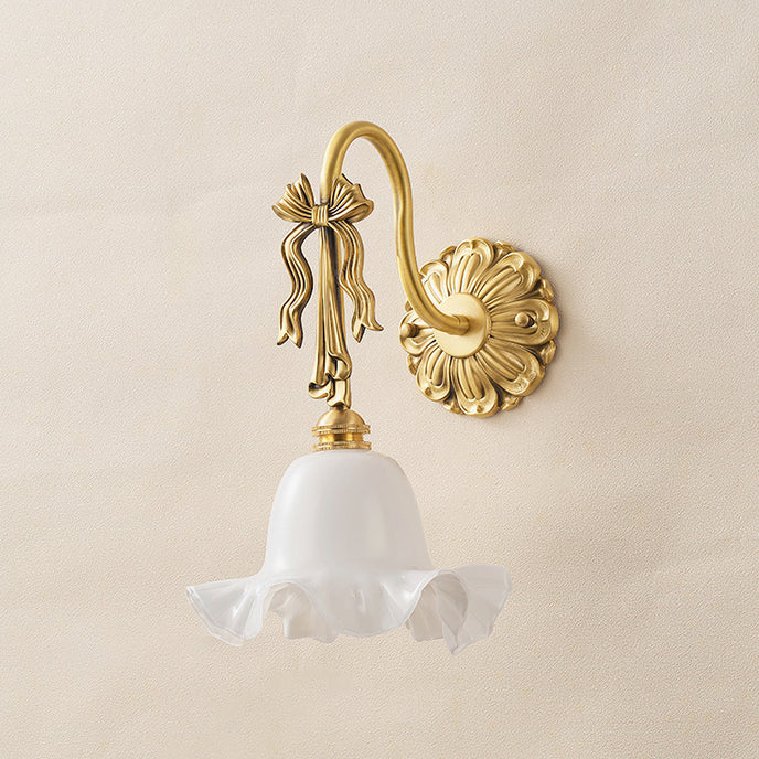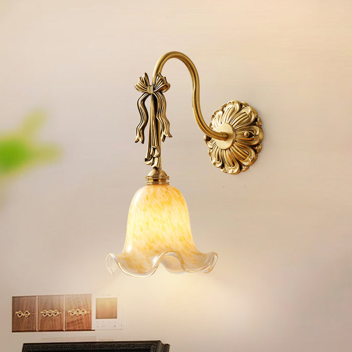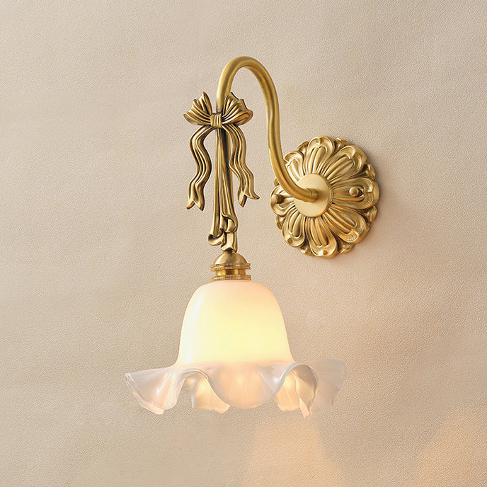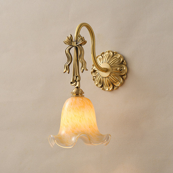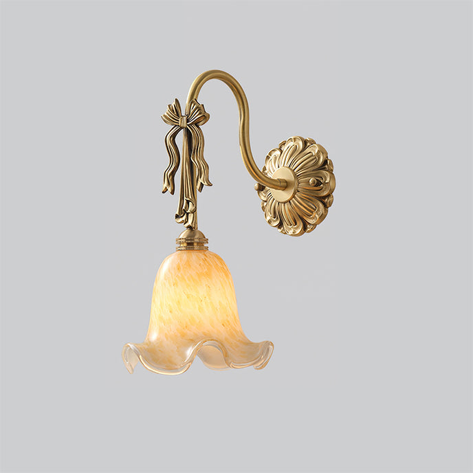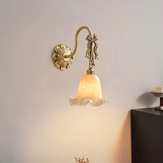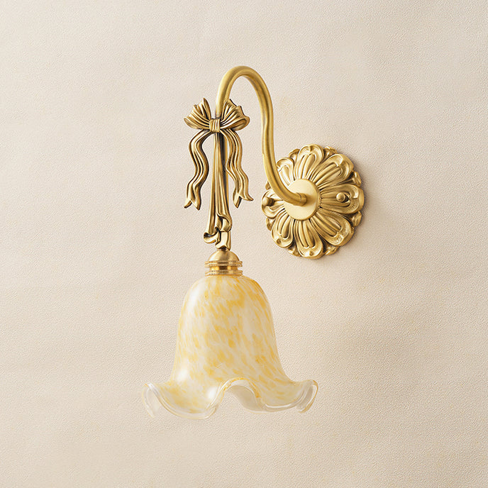 The Bella Flower Wall Lamp by Mooijane captures the essence of French romanticism with its graceful brass frame and hand-blown glass shade. A delicate bow detail on the curved arm adds vintage charm, while the flower-like glass softly diffuses light, creating a warm, poetic glow. Perfect for bedrooms, hallways, or dining spaces, Bella brings refined elegance and artistic character to any interior.