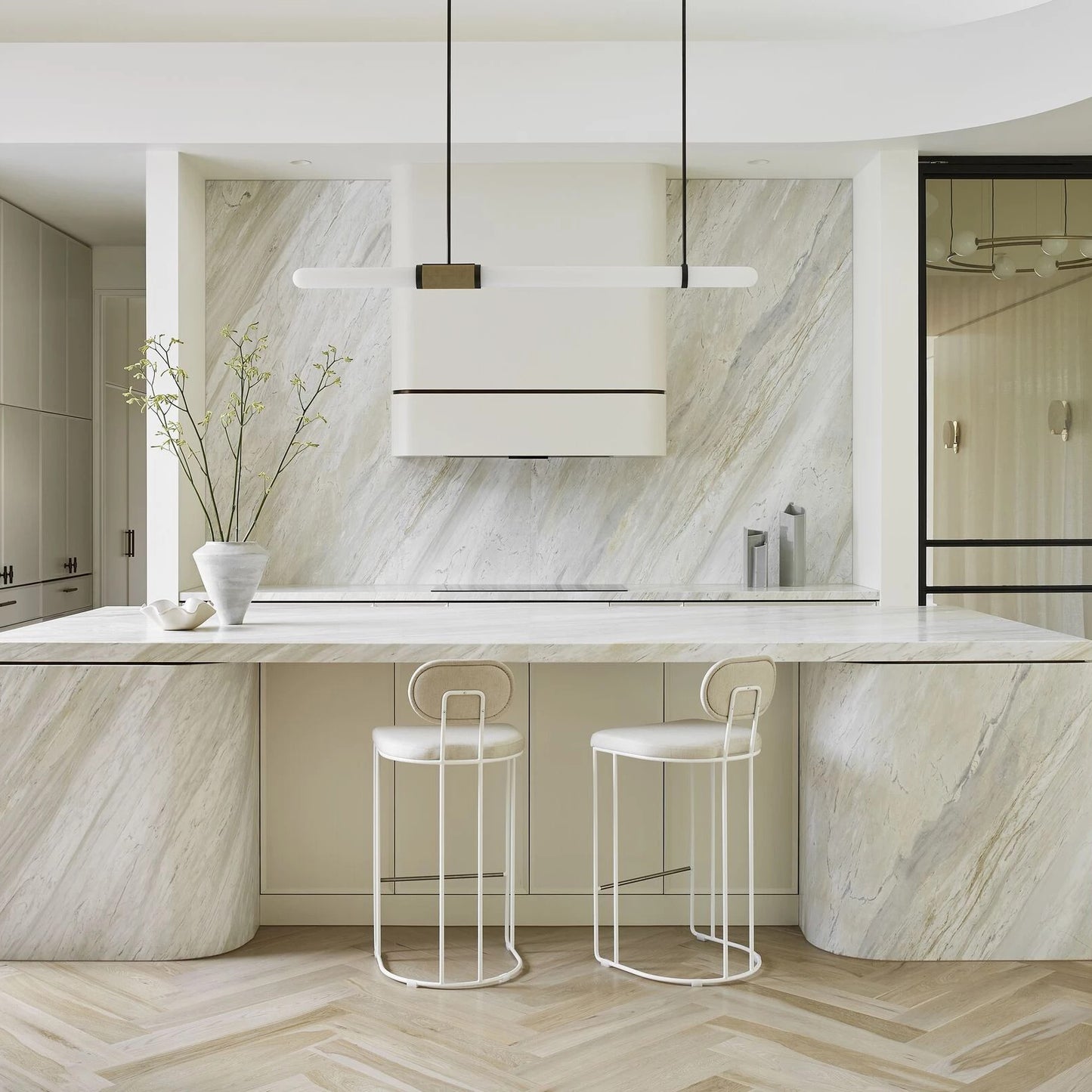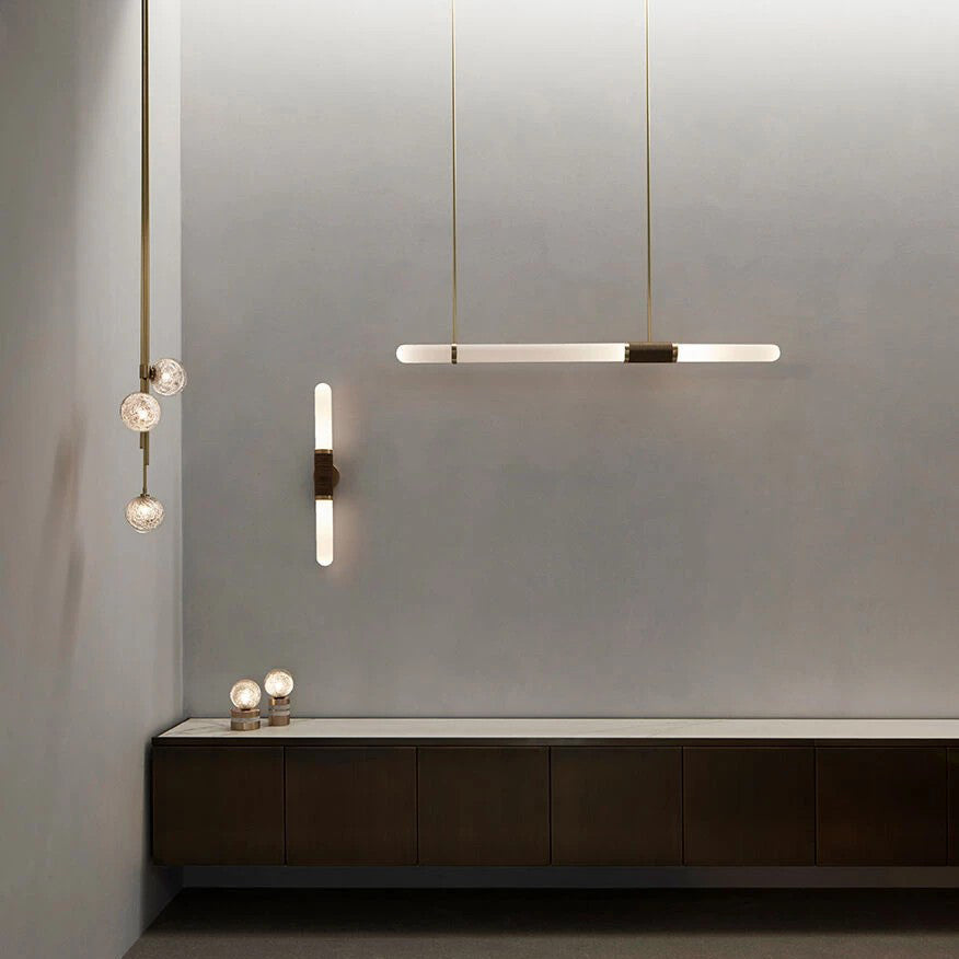 Famous for its barrel cuffs and inlaid with a fine brass mesh handwoven in Paris, the Changmei chandelier's slender proportions are covered from end to end with round glass that conceals the light source, embodying the quiet splendor of handcrafted glass and metalwork .