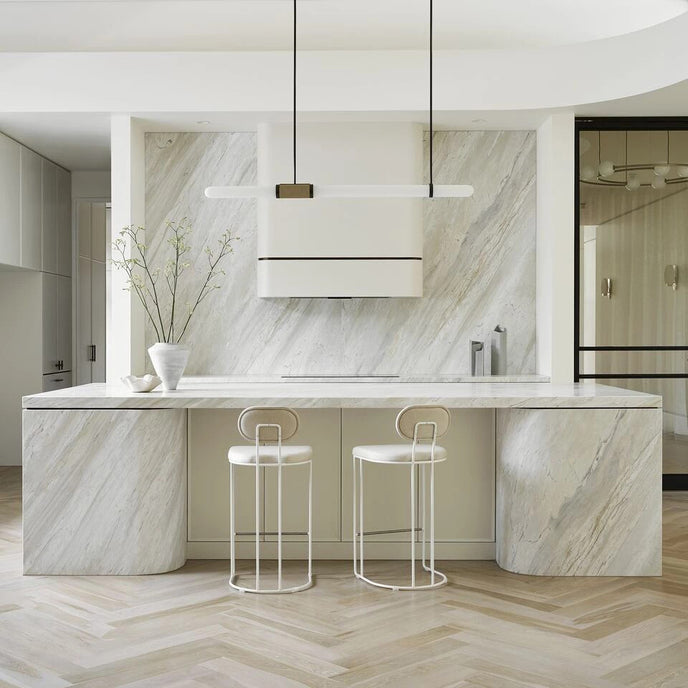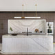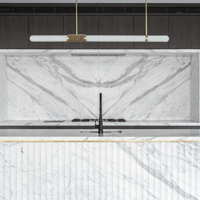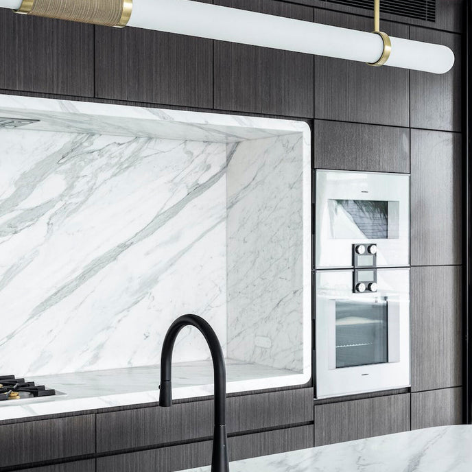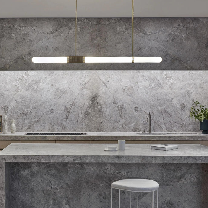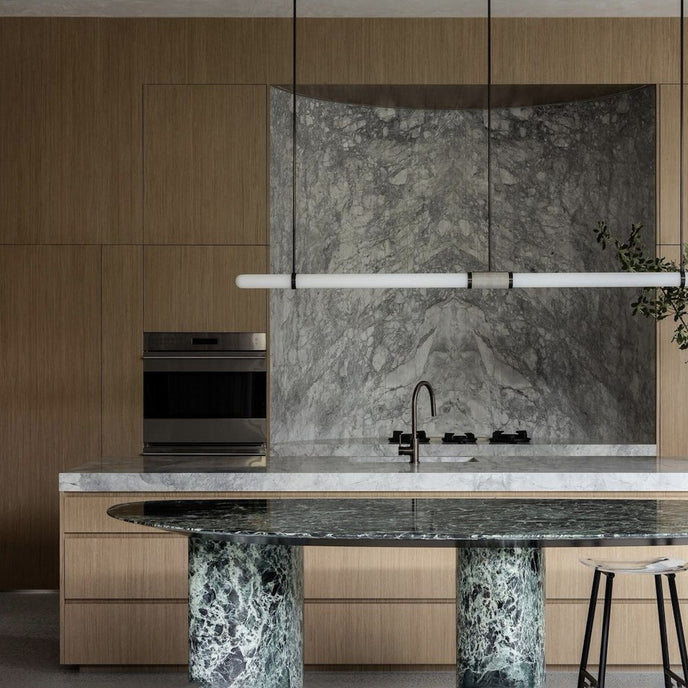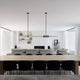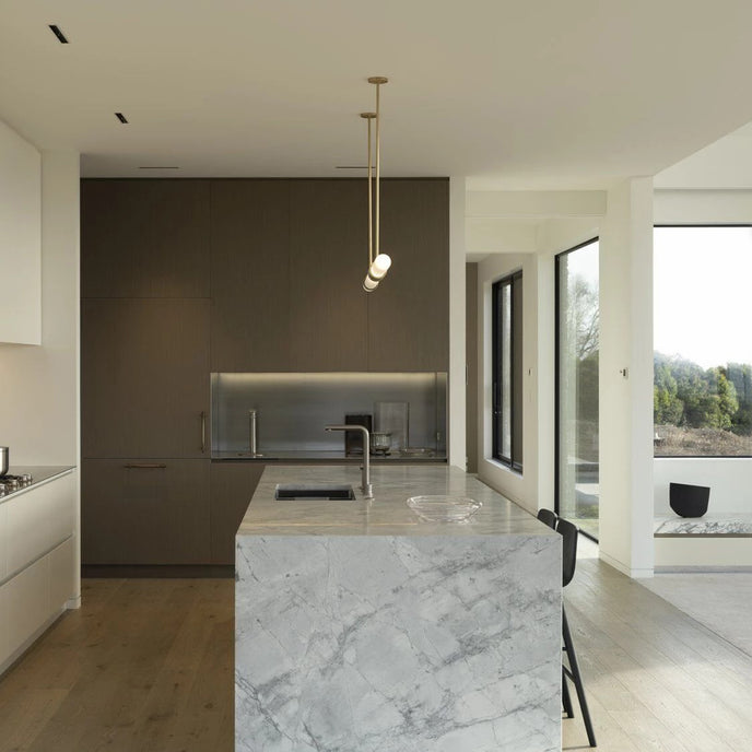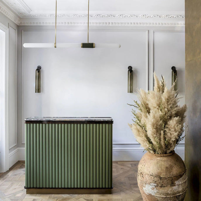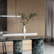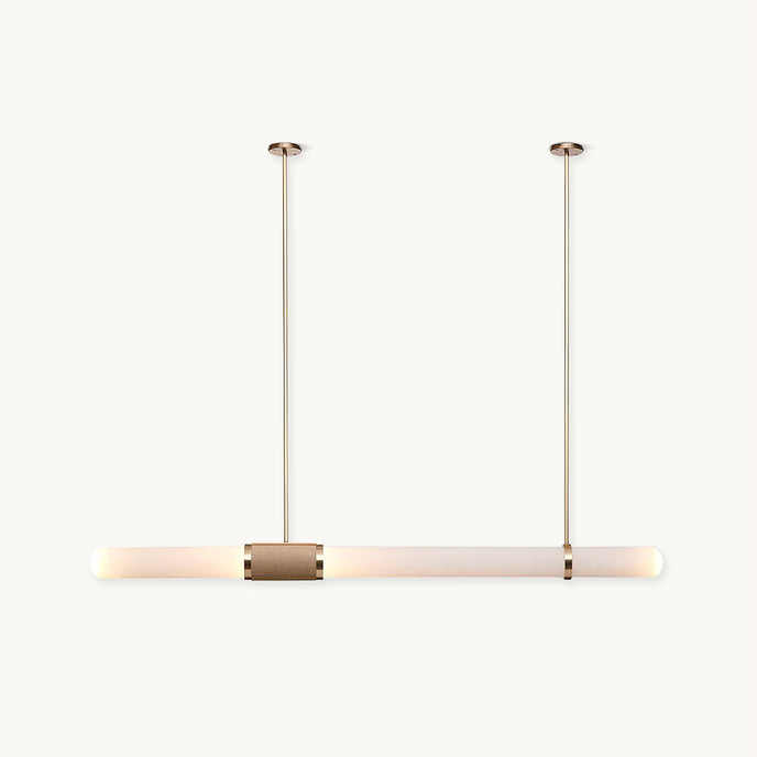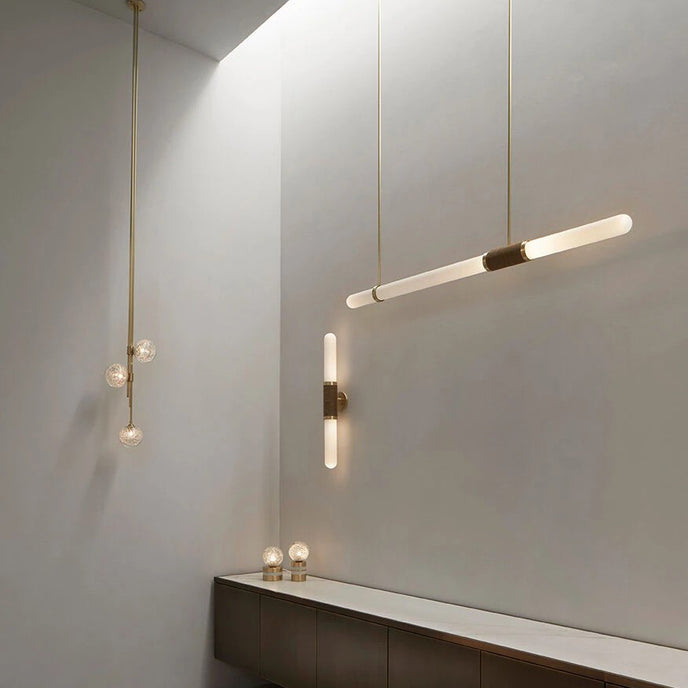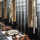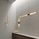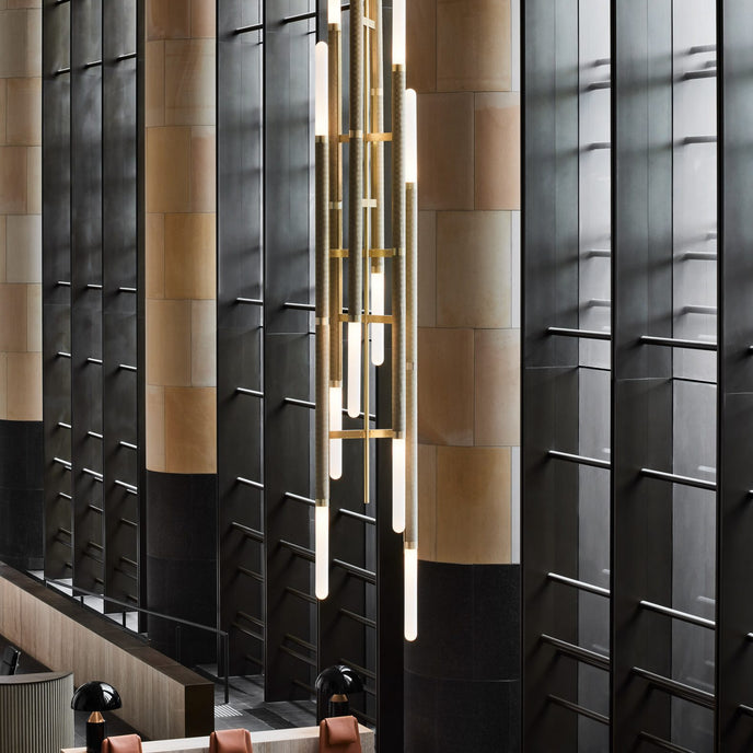 Famous for its barrel cuffs and inlaid with a fine brass mesh handwoven in Paris, the Changmei chandelier's slender proportions are covered from end to end with round glass that conceals the light source, embodying the quiet splendor of handcrafted glass and metalwork .