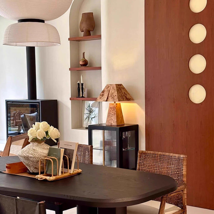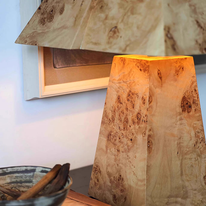The Clburl Burl Wood Table Lamp by Mooijane is crafted from a rare Burl Wood veneer known for its unique grain and rich depth of tone. Its faceted base and angled shade create a striking geometric silhouette that blends natural warmth with modern sophistication. Ideal for a gallery console, a sophisticated bedroom or a collector's room, this lamp is both functional lighting and an artistic centerpiece. It is the perfect blend of craftsmanship, unique character and timeless design.