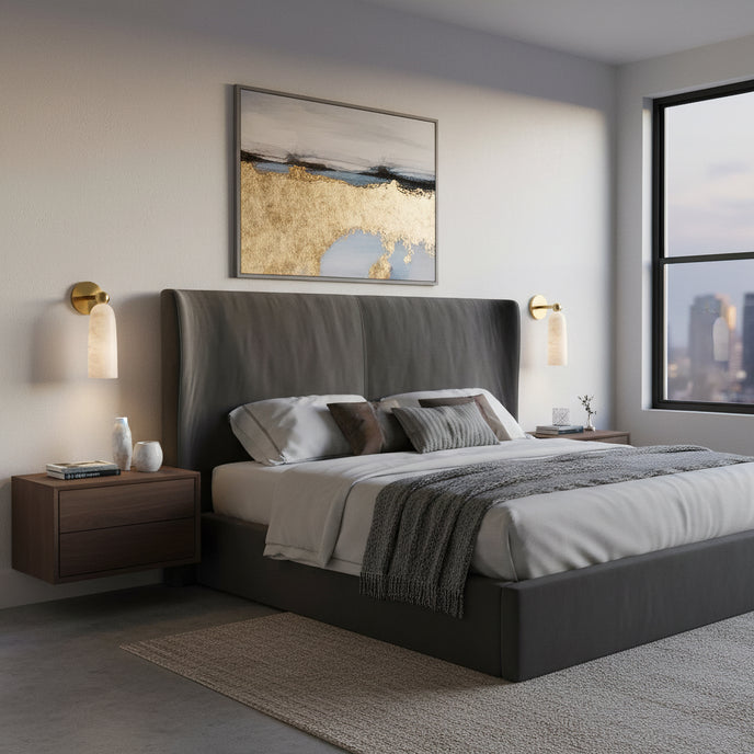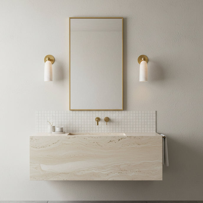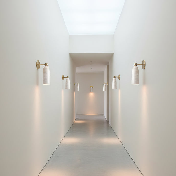 The Harlin Wall Light from Mooijane embodies quiet luxury with a contemporary, timeless design. Handmade from alabaster and solid cast brass, it combines natural materials with a minimalist aesthetic, adding refined elegance to bedrooms, living areas, or hallways.