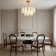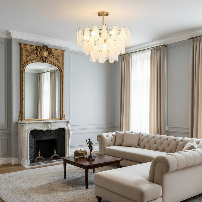 The Leon Chandelier by Mooijane exudes elegance with its unique oyster-shaped white glazed glass panels and gold finish. The soft diffused light from the multiple bulbs creates a warm and inviting atmosphere in any space. The chandelier features a high-quality wrought iron frame and translucent geometric glass layers to elevate your home decor.