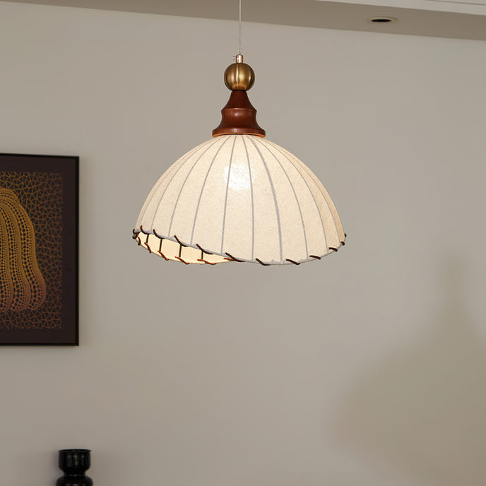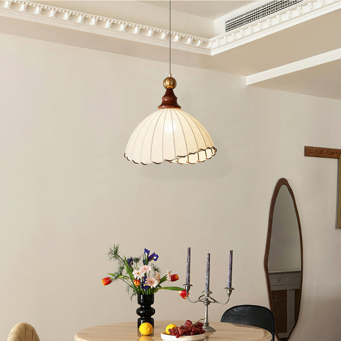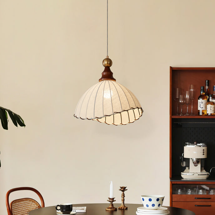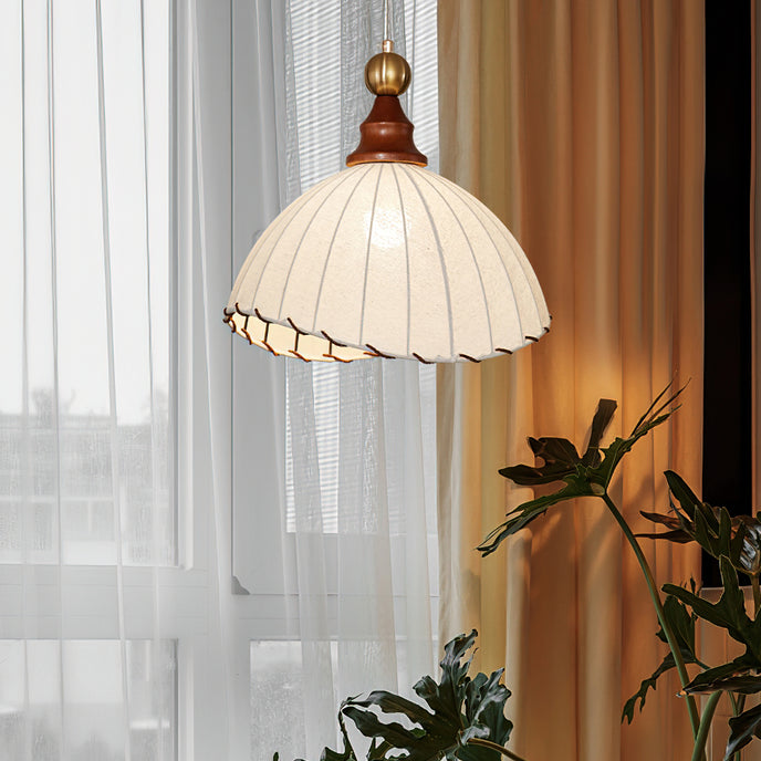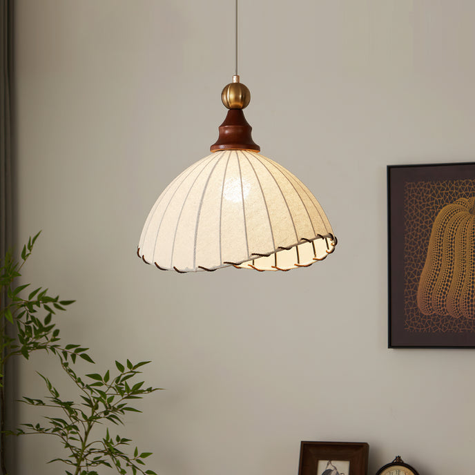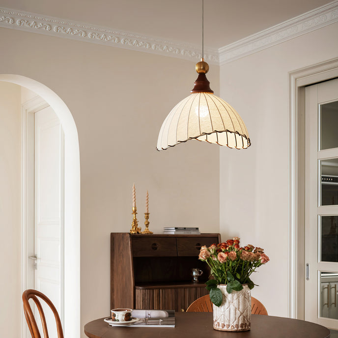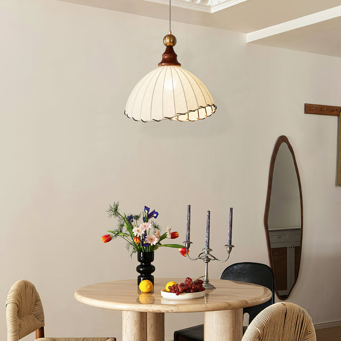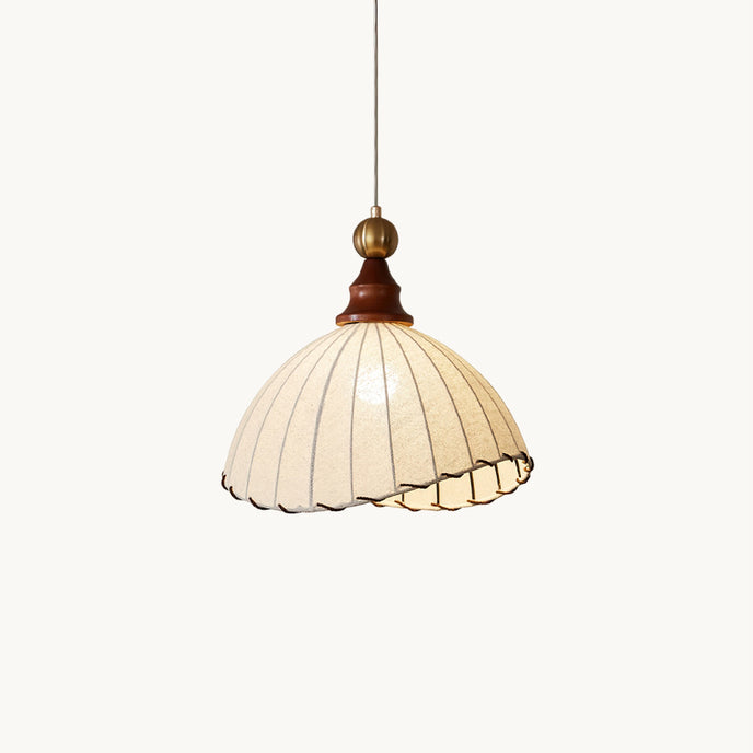 Introducing the Maris Pendant Lamp from Mooijane, a charming addition to any interior. With its softly scalloped dome shade and sleek wood accents, this lamp exudes sophistication. The refined metal detailing adds a touch of luxury, creating a warm and inviting ambiance in any space. Perfect for bringing timeless elegance and soft light to your home.