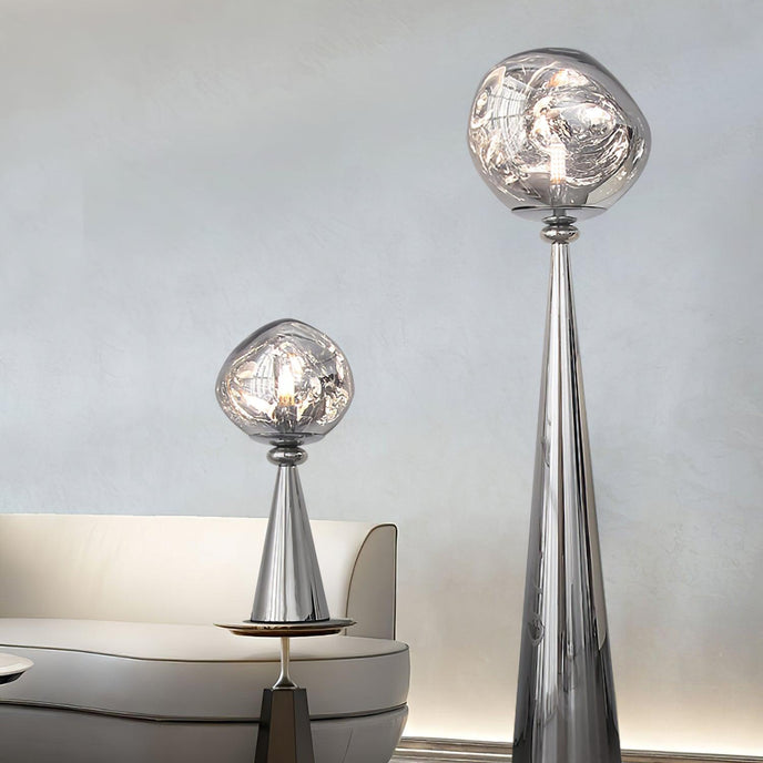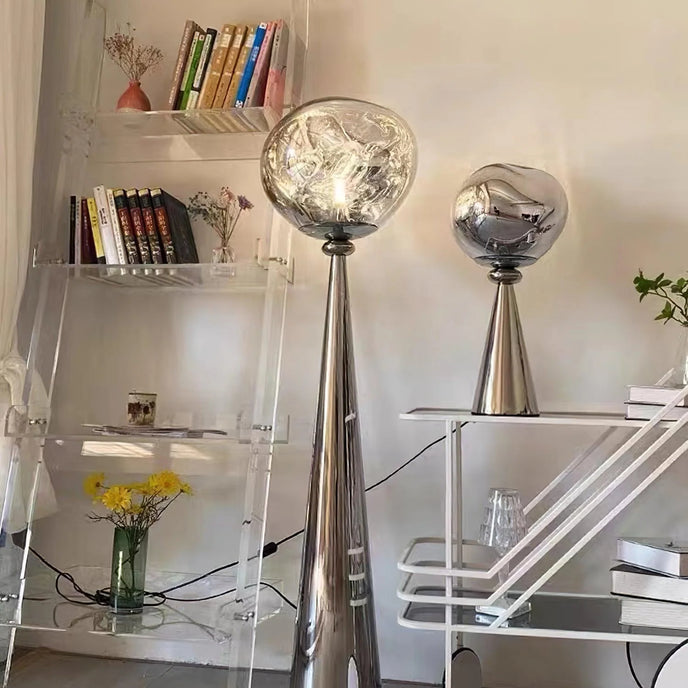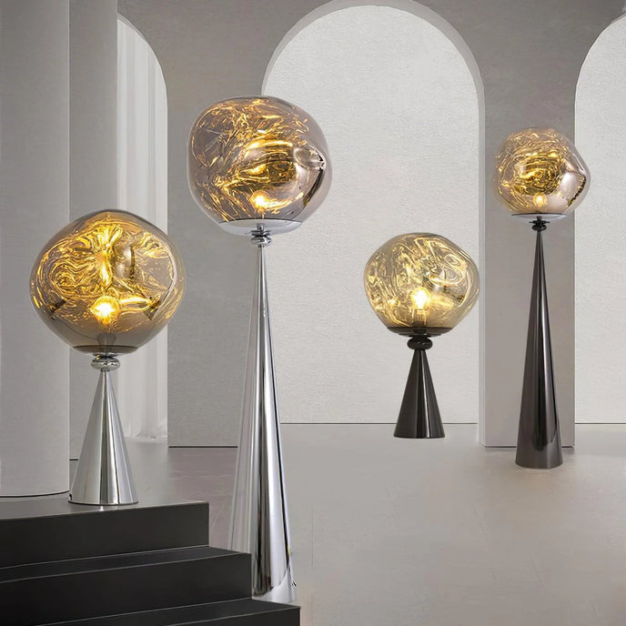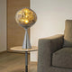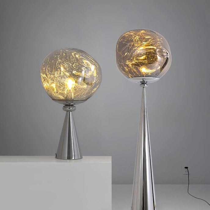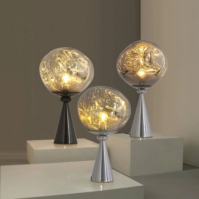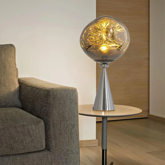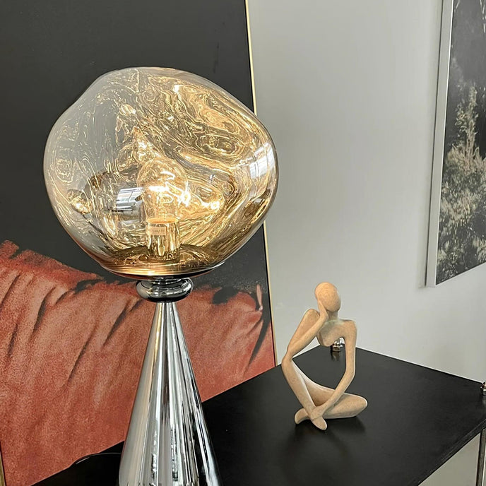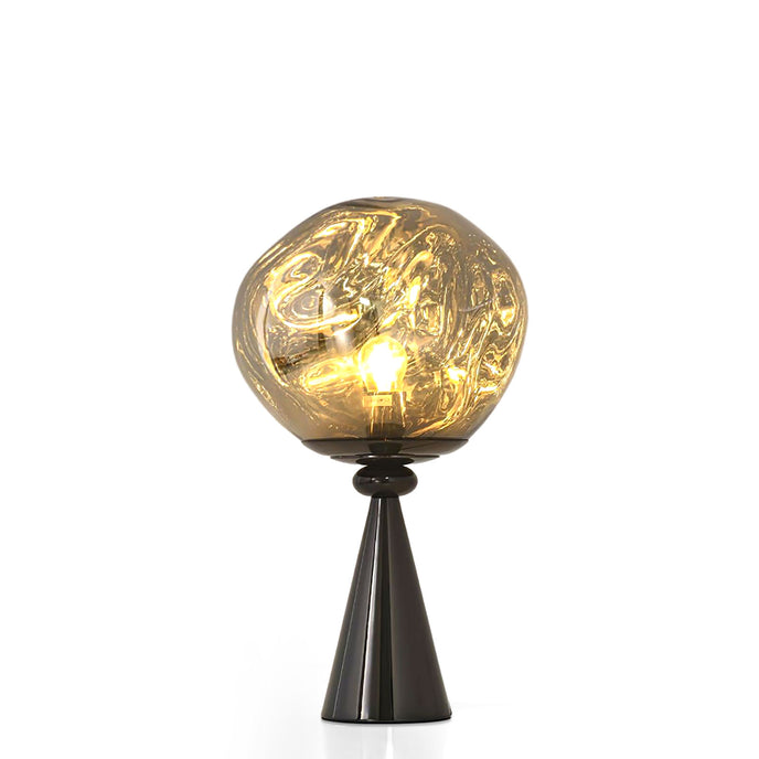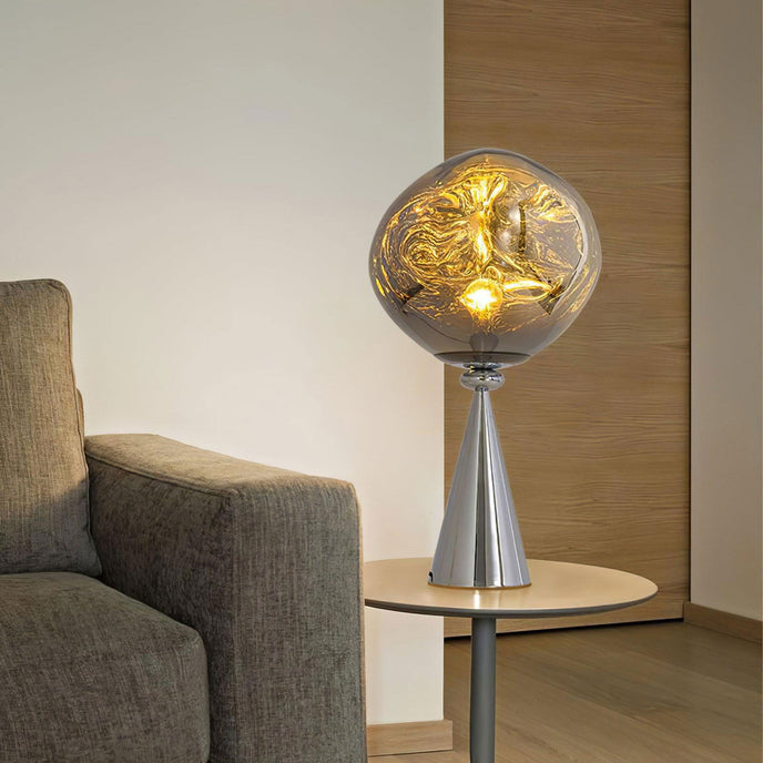 Translucent when on and mirror-finish when off, The Lava Gold Table Lamp is a beautifully twisted lighting sphere that creates a mesmerizing hot-blown glass effect. The Lava Gold Table Lamp are a series of distorted spherical pendants, half-metallised to create an extraordinary optic effect and cast an ethereal luminosity on their surroundings.