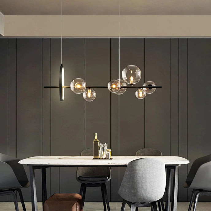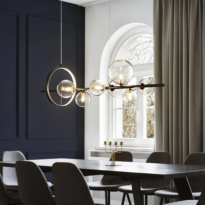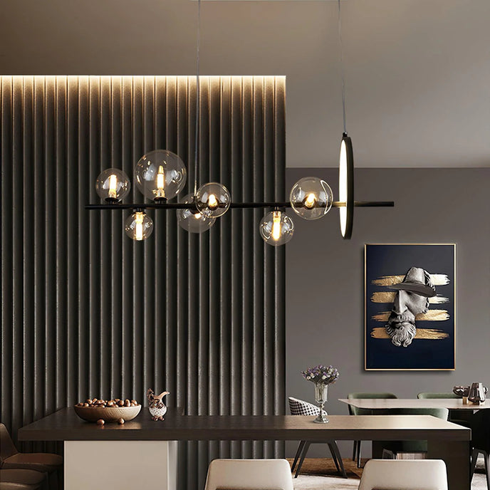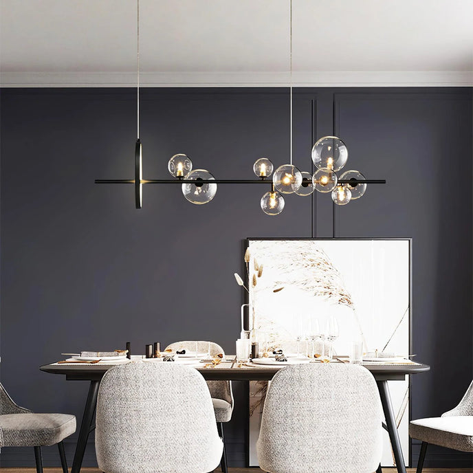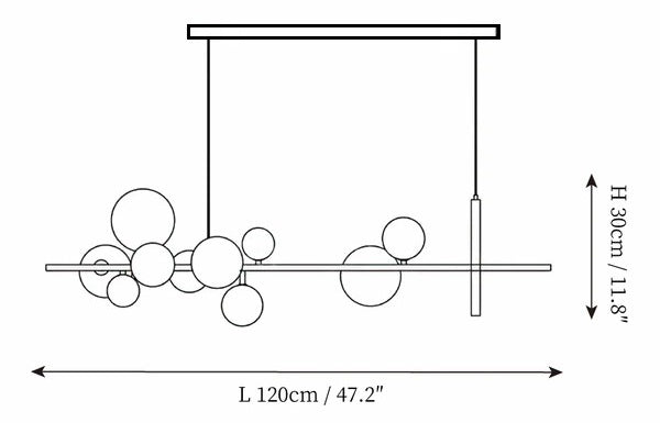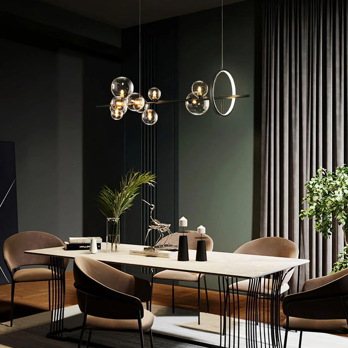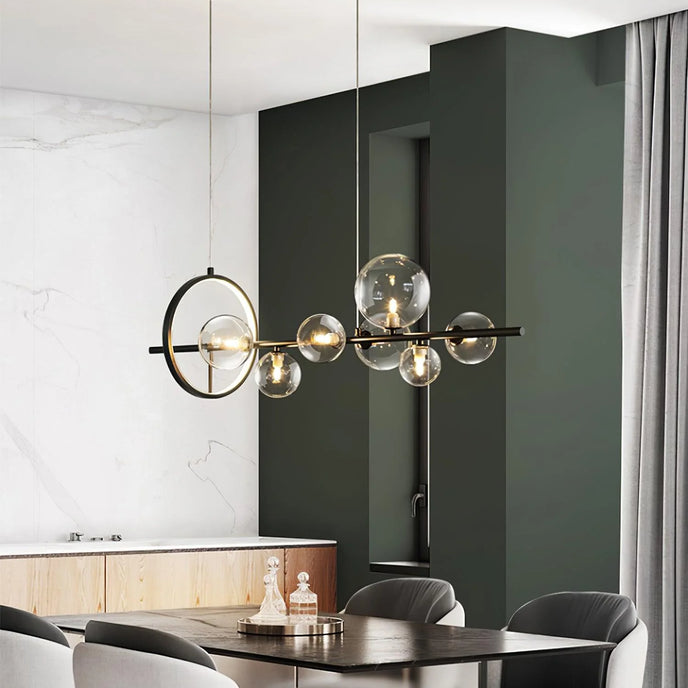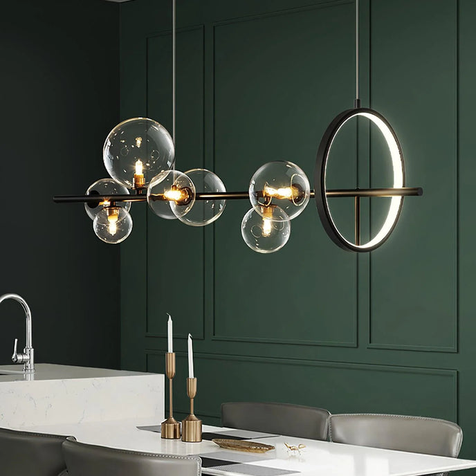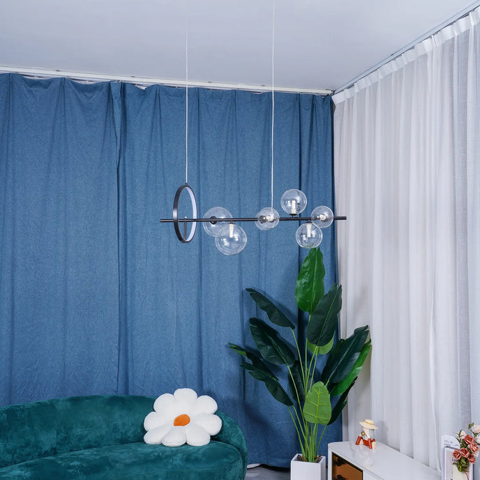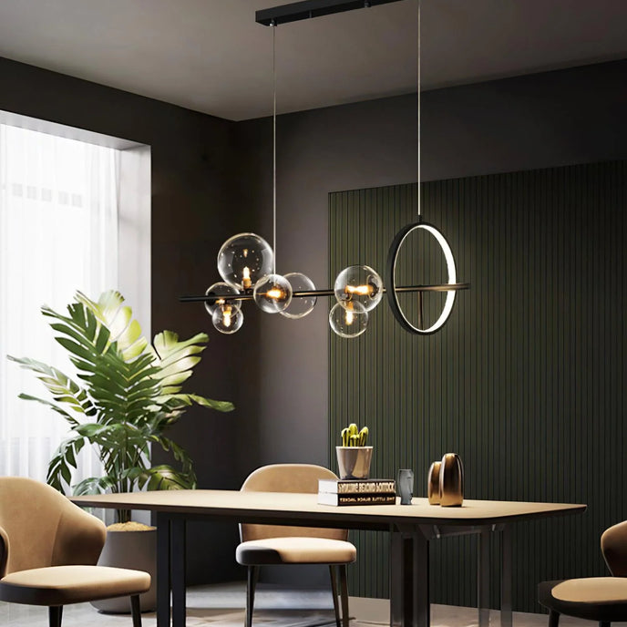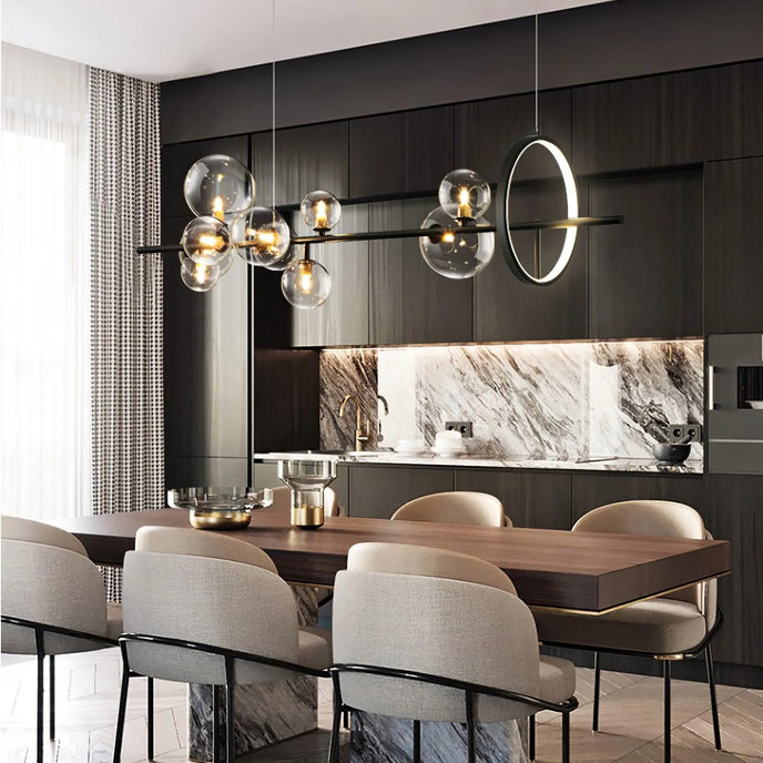 When it comes to lighting in the Scandinavian style, the reduced form and simple design are precisely the main features of the lamps. Our Glass Bubble Nordic Chandelier has striking glass balls as the dominant detail, which bring a modern design to any living room. The light combines a thin luminous LED circle and linear elements on which the glass lampshades are located.