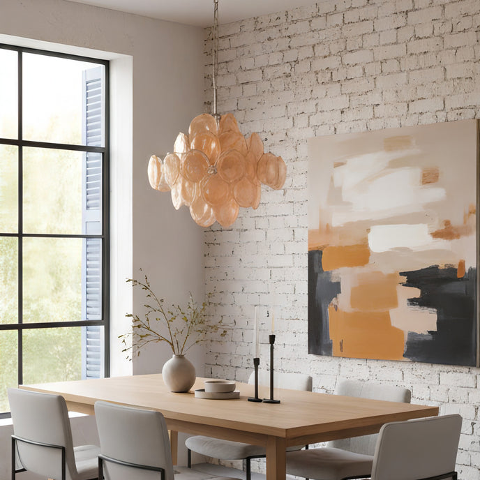 Add a touch of romance and elegance with the Murano Caramel Disc Chandelier from Mooijane. Handblown with soft, swirling pink tones, this stunning chandelier creates a mesmerizing visual effect as light bounces and diffuses in a warm and inviting glow. Ideal for living rooms, dining areas, or bedrooms, it brings sophistication and artistic flair to any space with its unique and luxurious design.
