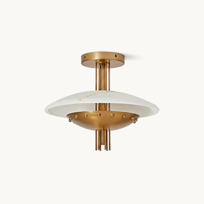 The Patus Ceiling Light by Mooijane features a bold layered design with a refined retro-futuristic feel. Crafted from faux alabaster and iron, it pairs a softly glowing shade with a sleek metal frame for warm ambient light and strong sculptural appeal. Perfect for living rooms, dining areas, and sophisticated interiors, it adds depth, character, and modern elegance.