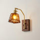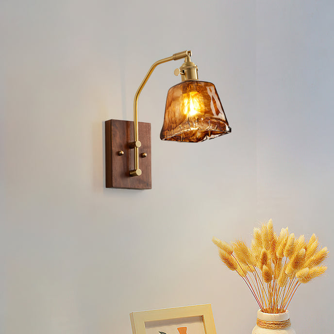 Elevate your space with the Peti Vintage Wall Lamp from Mooijane. Its amber-hued glass shade and brass armature exudes classic elegance, while the intricately patterned glass casts warm, dappled light. The wooden mounting and brass details add a rustic charm to the mottled glow, creating a nostalgic atmosphere.
