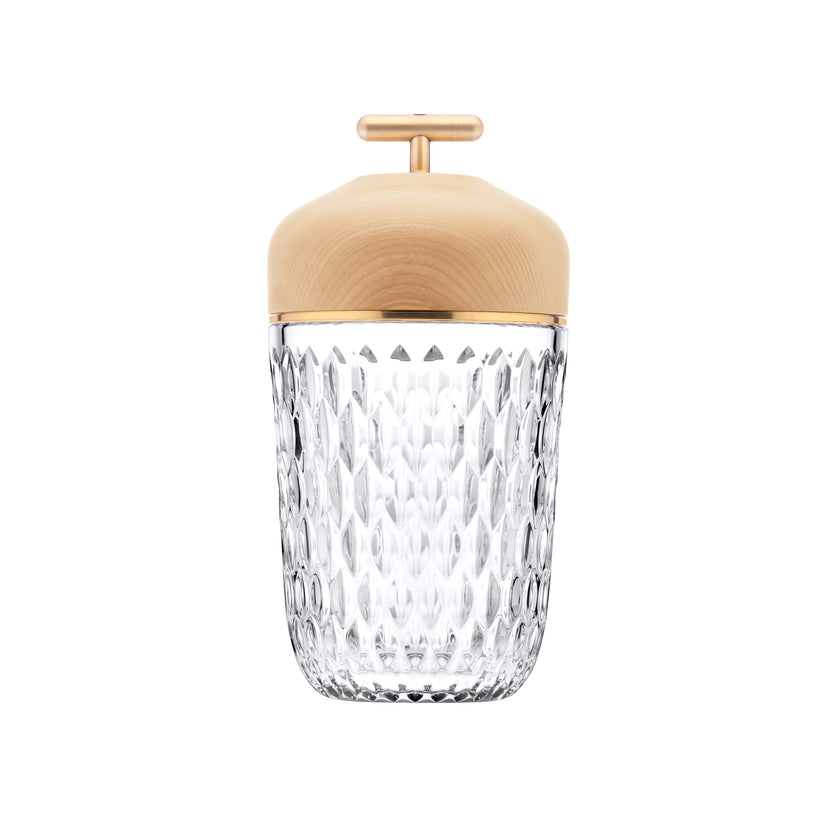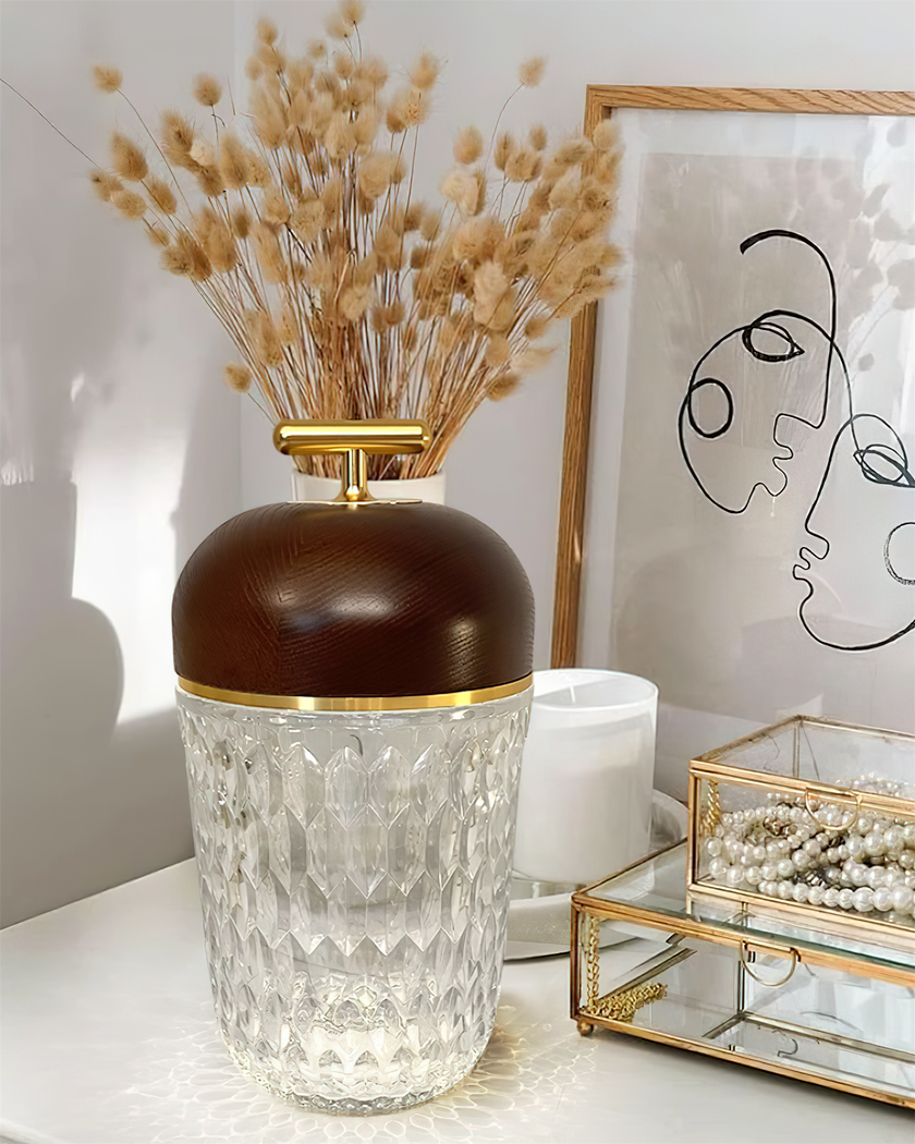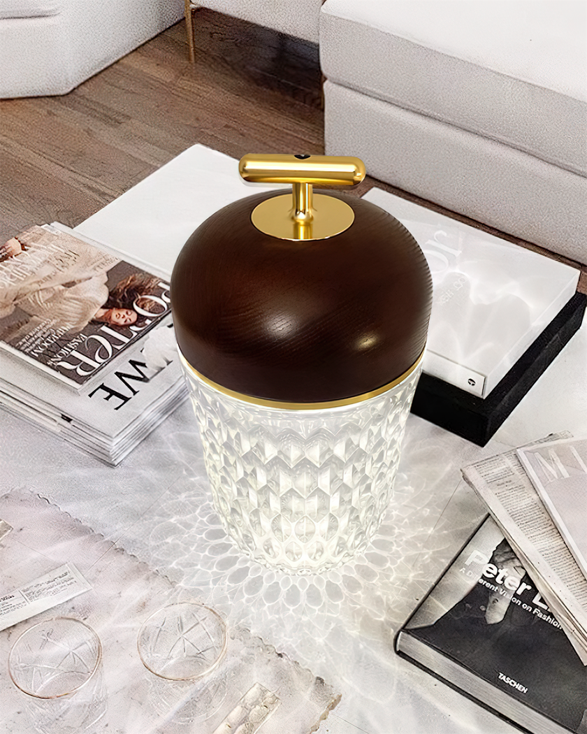 Illuminate your space with the Pine Cone Portable Table Lamp from Mooijane. This small yet powerful night light features a touch switch for convenience and adjustable brightness for a customizable ambiance. The bevel-cut crystal glass and modern details make it a stunning addition to any table, desk, or patio. Glamorize your decor with the Pine Cone Portable Table Lamp in Walnut.