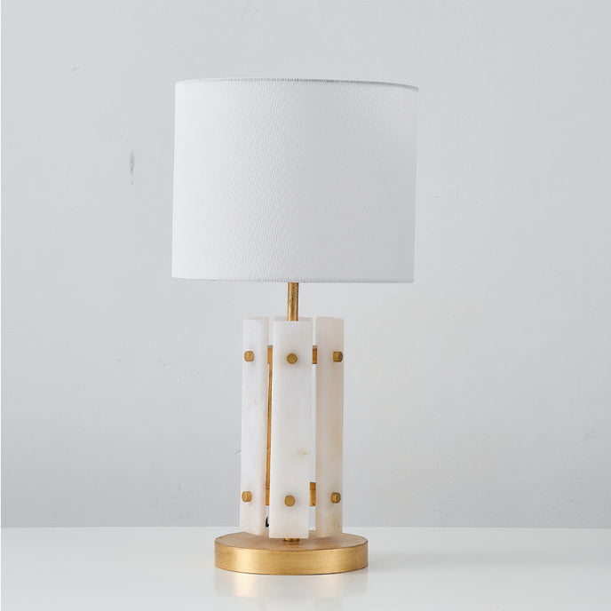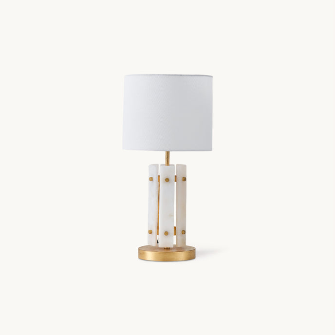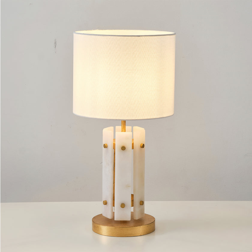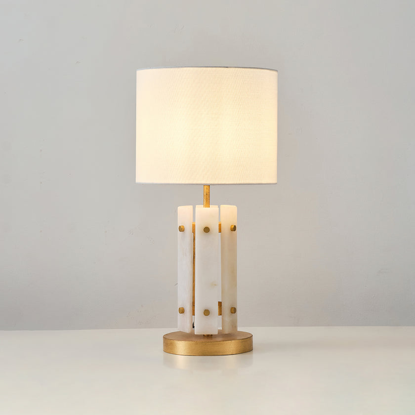 The Regina Table Lamp by Mooijane combines alabaster and metal for a serene and elegant design. Vertically arranged alabaster pieces softly diffuse light, creating a glow reminiscent of frozen ice crystals. Gold accents on the metal base add a touch of refinement and luxury. Paired with a simple fabric shade, it casts warm, subtle light, making it perfect for a bedroom bedside, living room corner, or any space in need of understated sophistication.