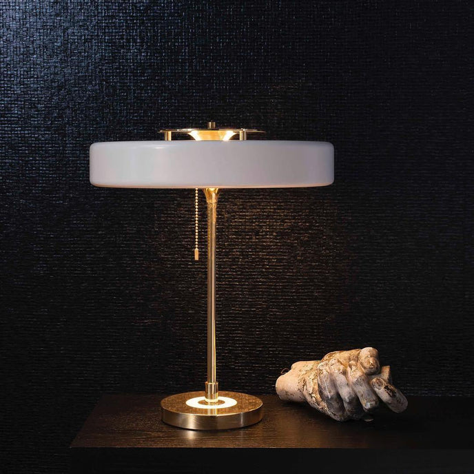 Revolve Table Lamp throws away the culture we live in today, with contemporary lighting built to last. Each piece will age and mature with you; Any knocks and scratches will only add to its patina and story. Revolve Table Lamp is a striking light offering a warm glow to any surface through its Acrylic diffuser.