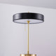 Light escapes through the top metal feature to highlight the sleek metal shade. A metal pull chain switch hangs over a solid metal base with an inset color ring that matches the shade color. Light also escapes through the top metal feature to add highlights to the spun metal shade.