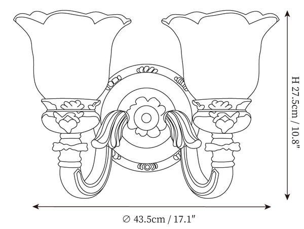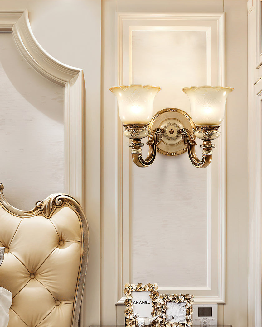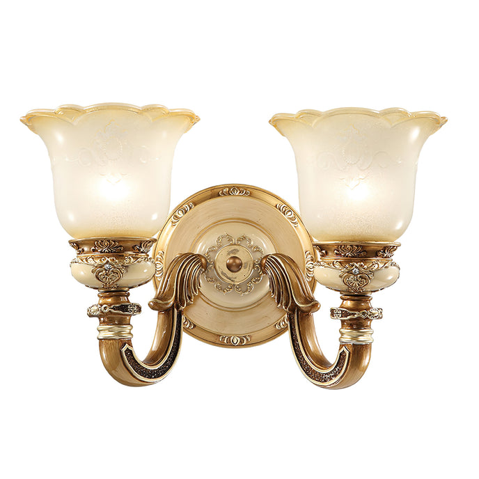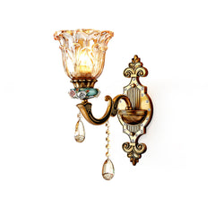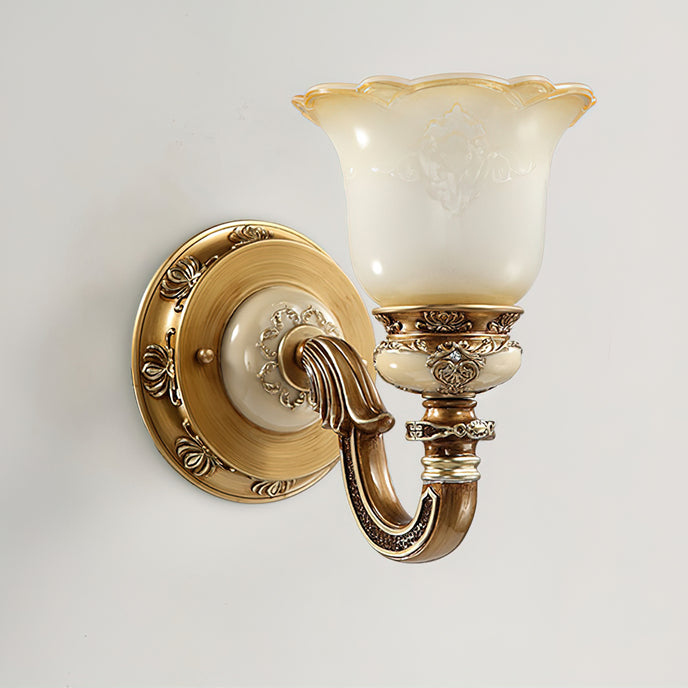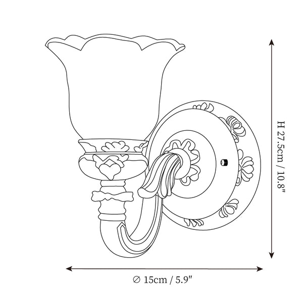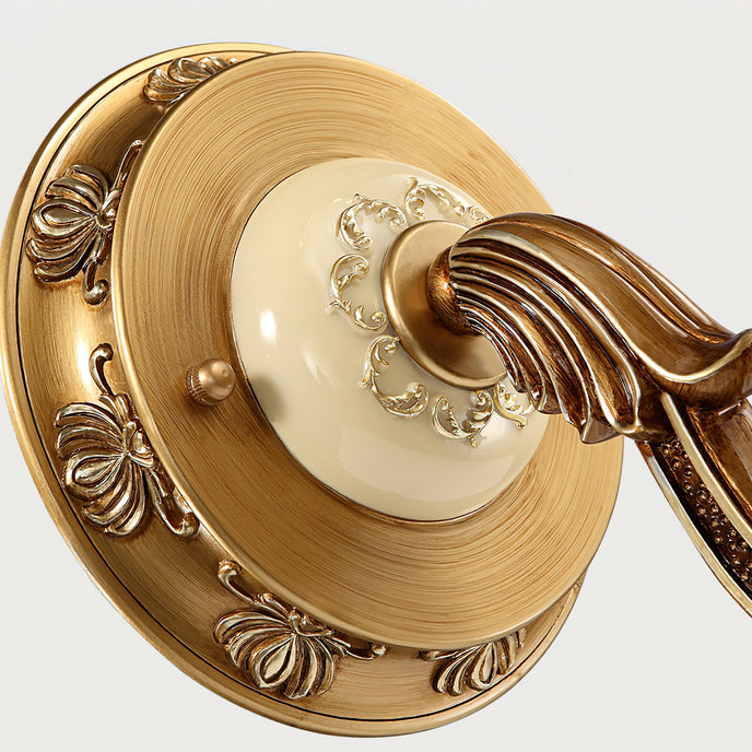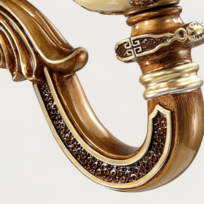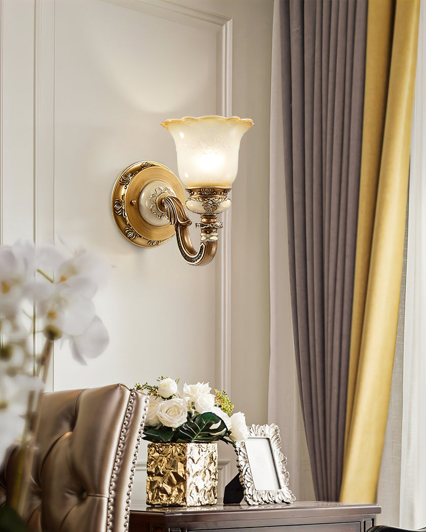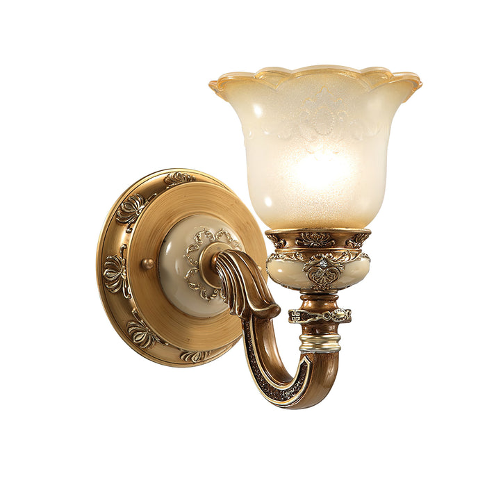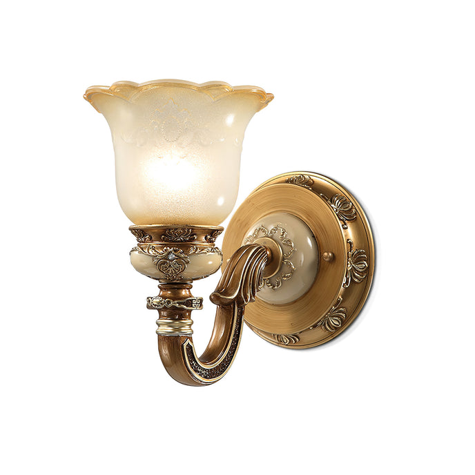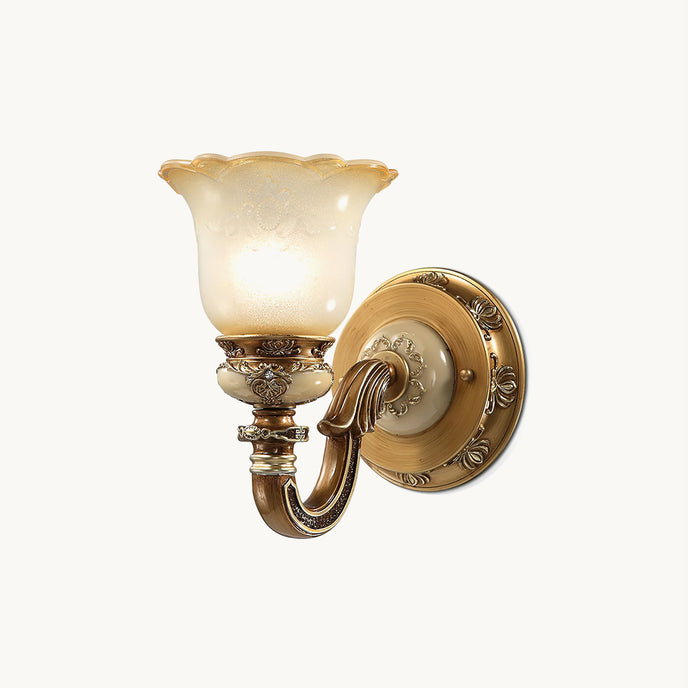 The Royal Bafang Wall Lamp is a sophisticated and exclusive statement piece crafted with strong iron and expertly carved resin for a timeless, regal look. Emitting a soft, warm light through a beautiful glass shade, this lamp will be the exquisite centerpiece of any room, radiating elegance to transform a space into a luxurious haven.
