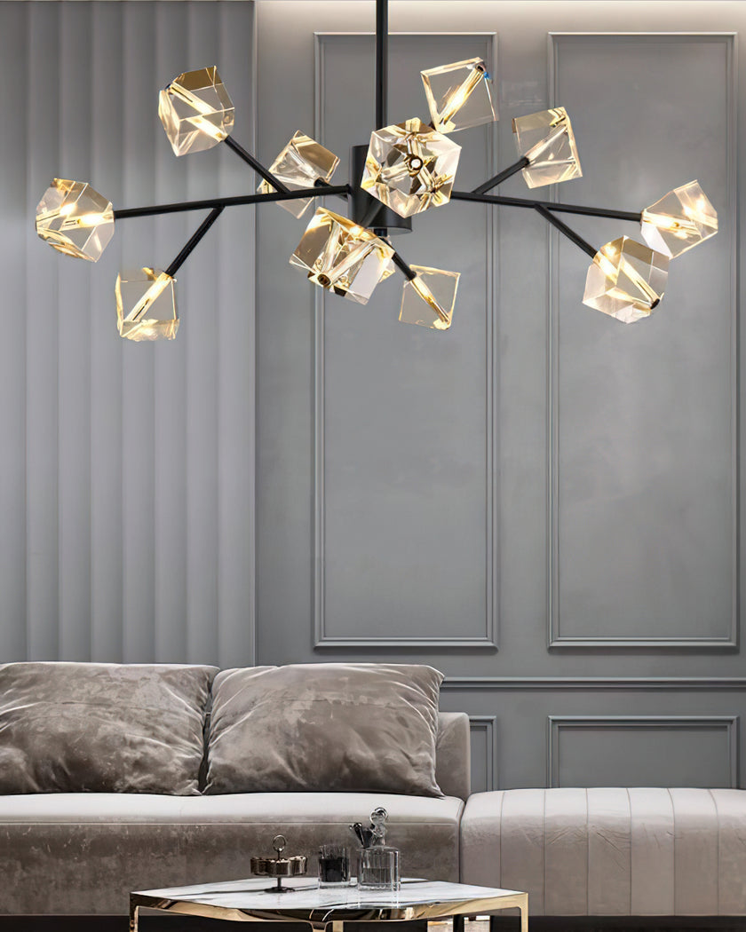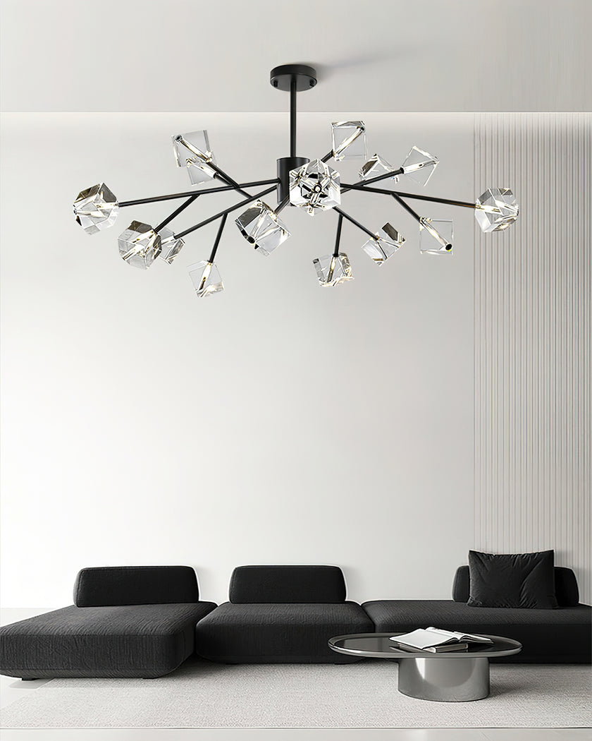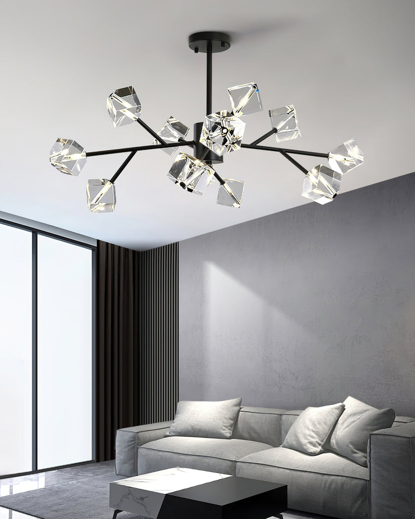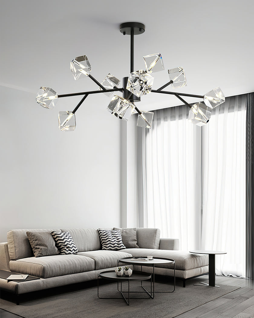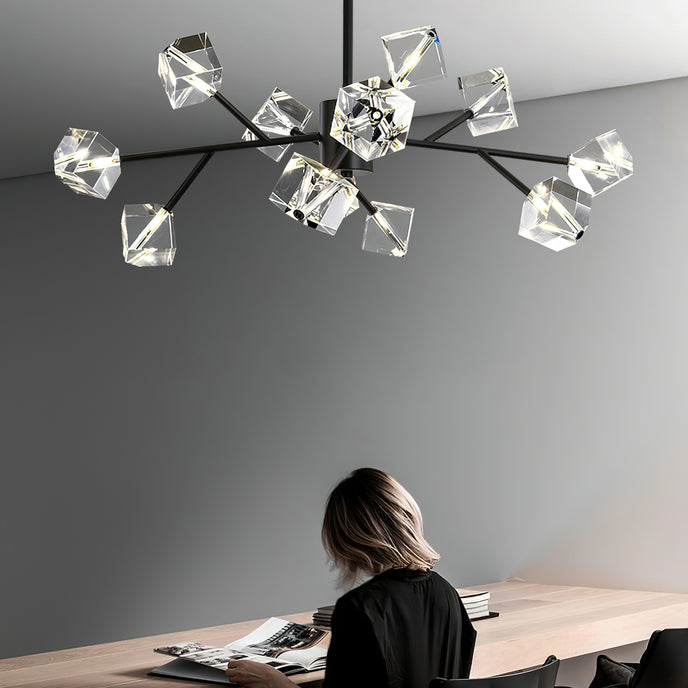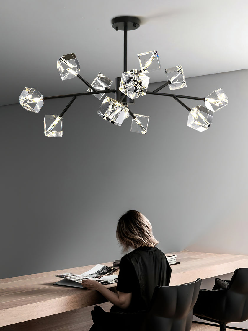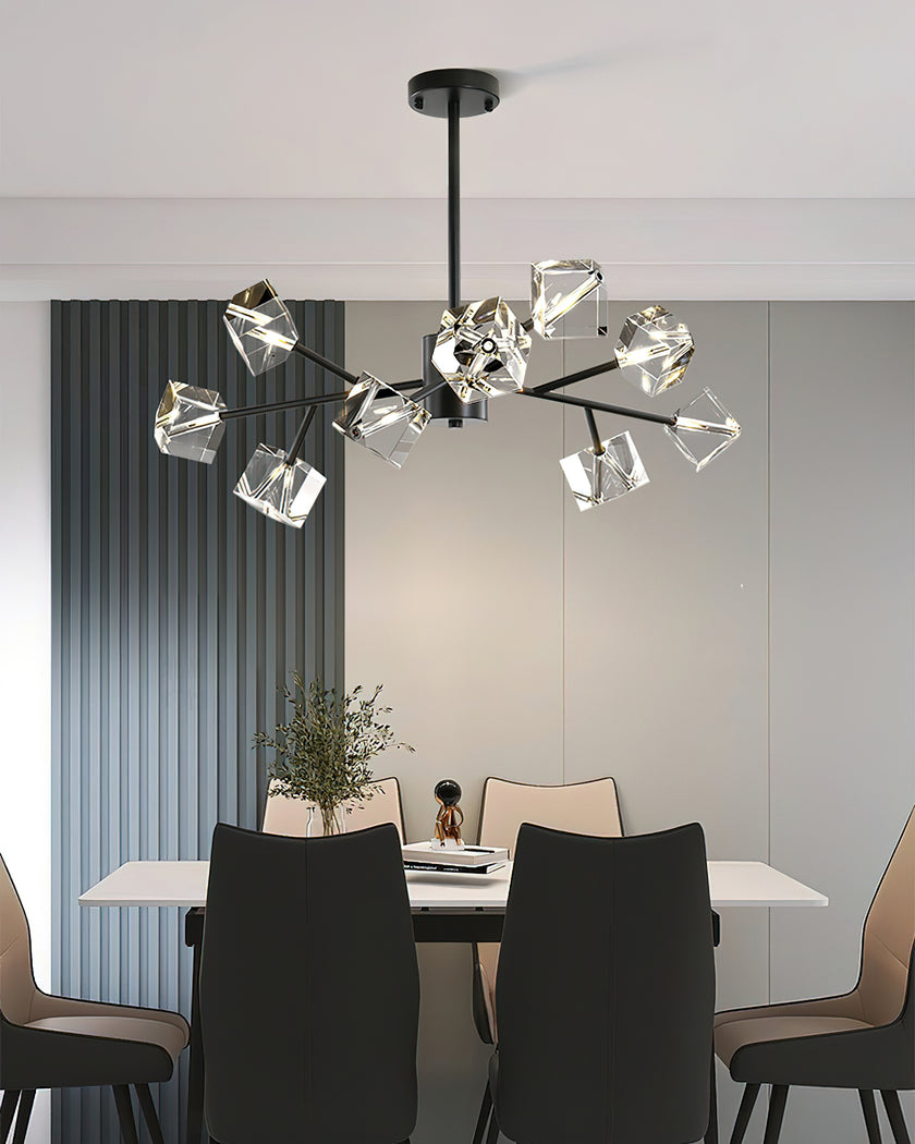 Light up your interior with this Rubik's Cube Ten Positive Chandelier. Crafted with square crystal, its diamond-like internal refraction and reflection illuminate the room with dazzling light. Finished with crystal prismatic cutting, each angle displays a different charm of light and shadow. Enjoy a clutter-free look without too many modifications, even during the day when natural light is available. Soft edges provide a safe touch, while its crystal clarity, delicate texture, and gorgeous refractions make it an opulent touch of sophistication.