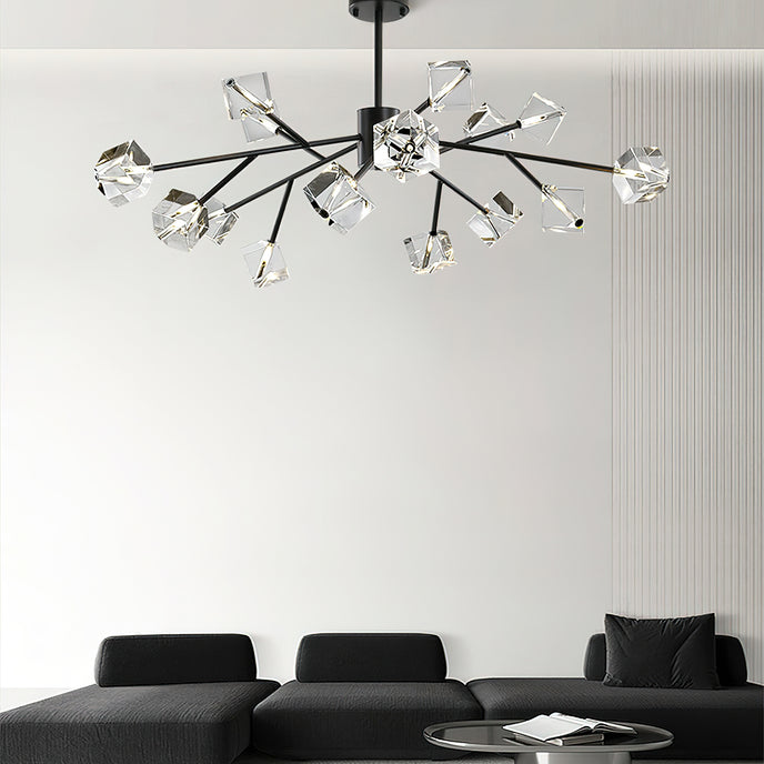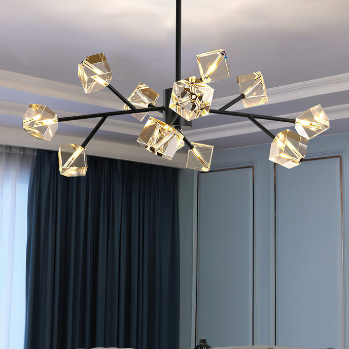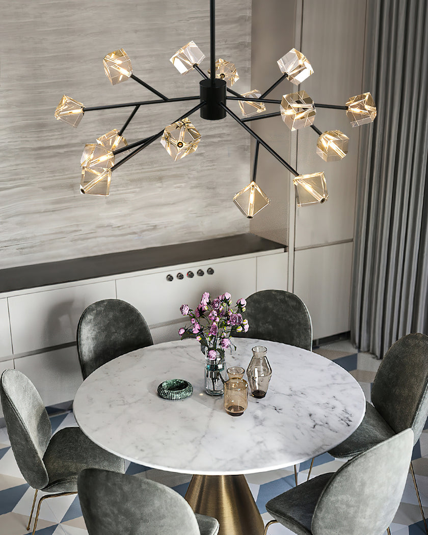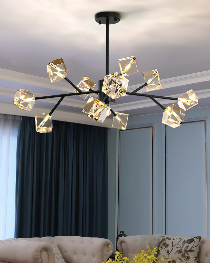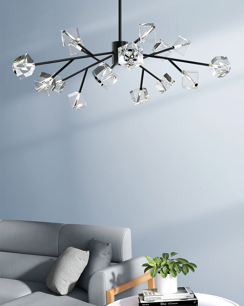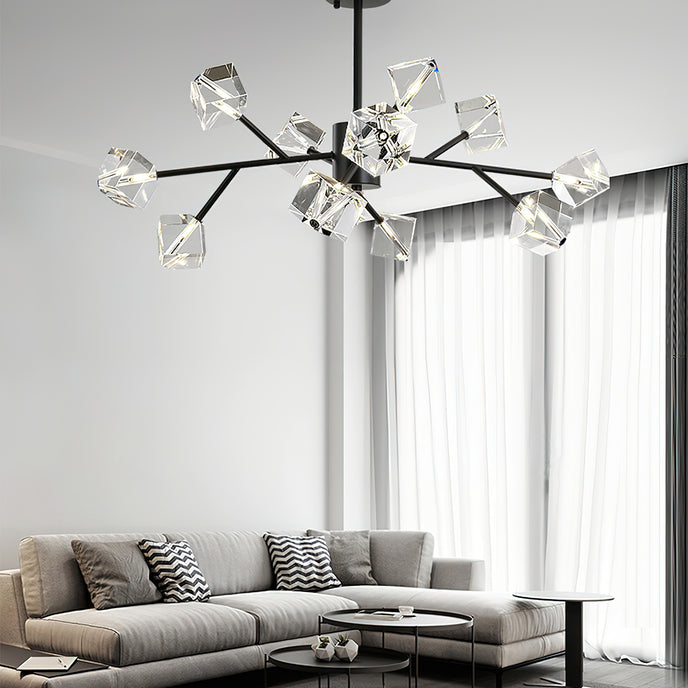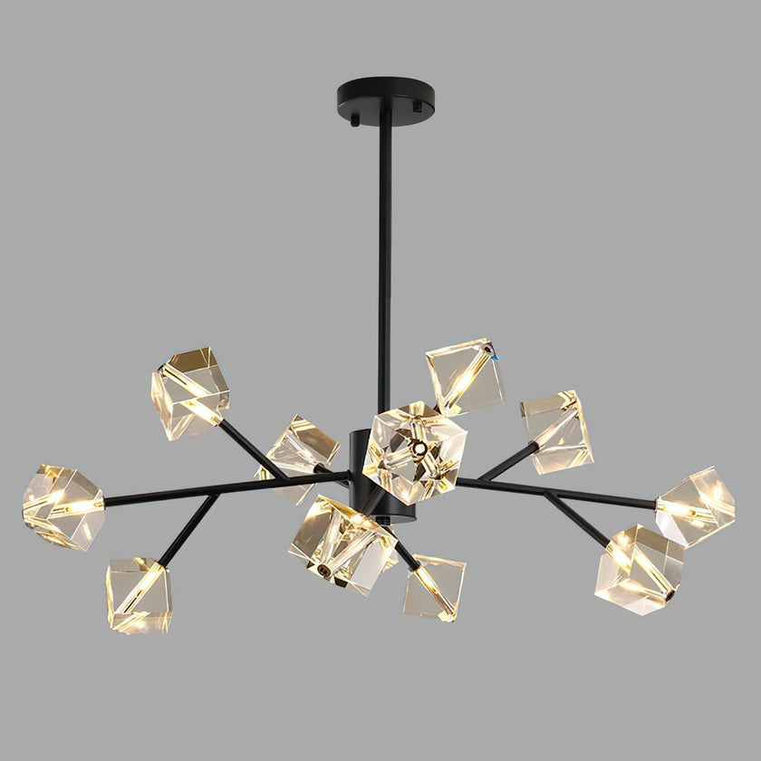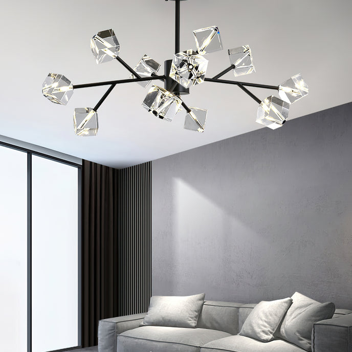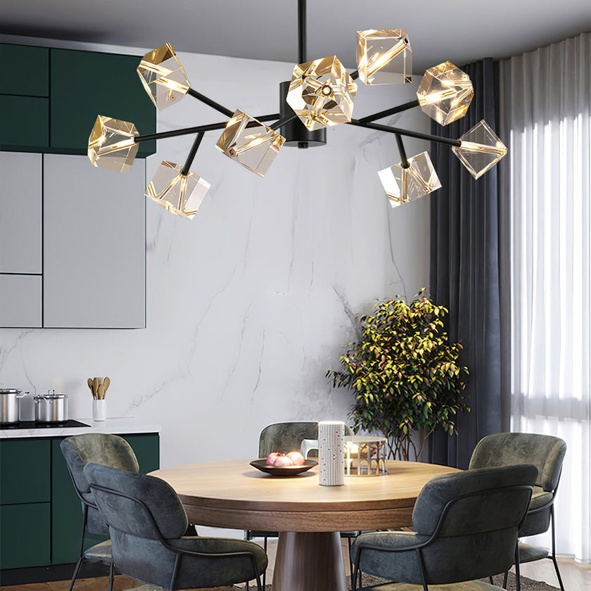 Light up your interior with this Rubik's Cube Ten Positive Chandelier. Crafted with square crystal, its diamond-like internal refraction and reflection illuminate the room with dazzling light. Finished with crystal prismatic cutting, each angle displays a different charm of light and shadow. Enjoy a clutter-free look without too many modifications, even during the day when natural light is available. Soft edges provide a safe touch, while its crystal clarity, delicate texture, and gorgeous refractions make it an opulent touch of sophistication.