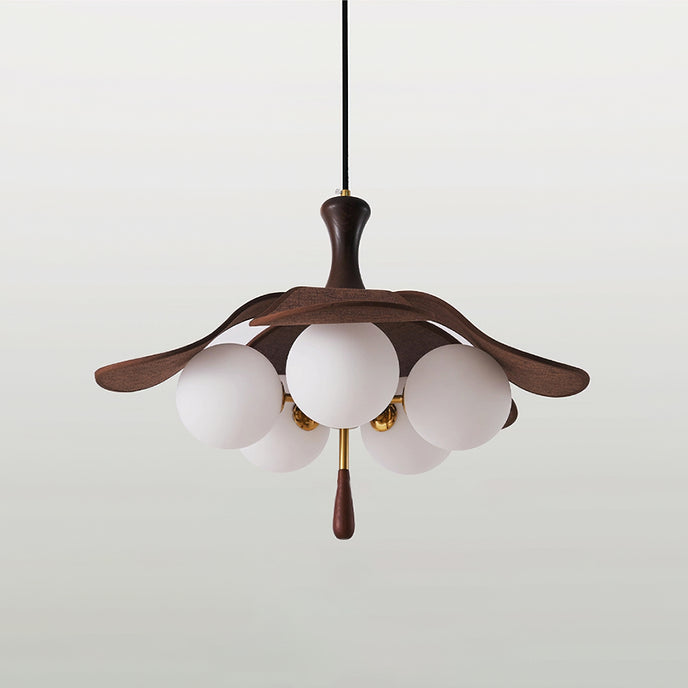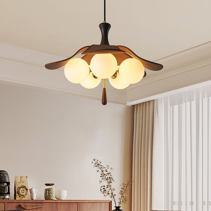 The Stilnovo Pendant Lamp from Mooijane combines wood, fabric, and glass to create a harmonious blend of natural warmth and modern elegance. Its smooth wooden frame highlights exceptional craftsmanship, while subtle fabric accents soften the design. Rounded glass shades, arranged like blooming petals, diffuse light evenly, filling any room with a cozy and inviting glow—perfect for living rooms, dining areas, or bedrooms.