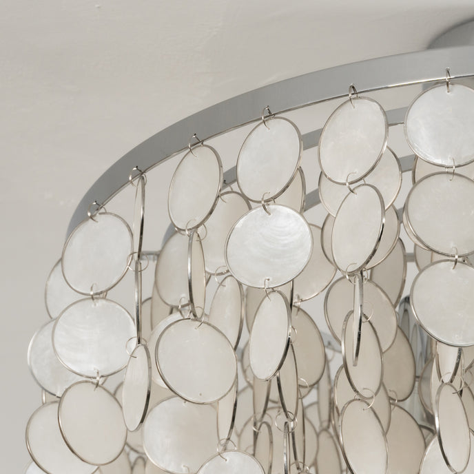 The Tallent Shell Ceiling Lamp by Mooijane features a tiered design with luminous shell-like discs for a look that feels airy, elegant, and softly sculptural. It diffuses light beautifully, adding subtle texture and a serene glow to bedrooms, dining areas, and refined living spaces.