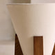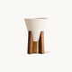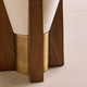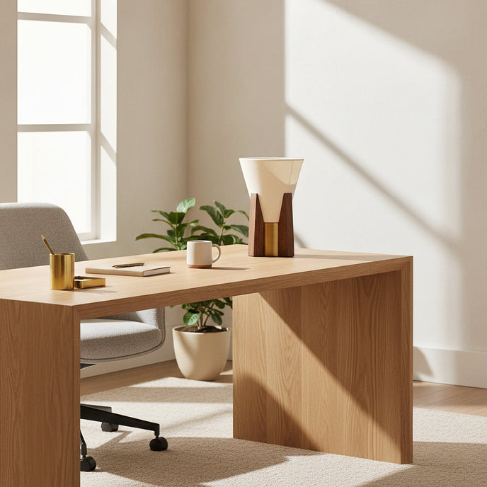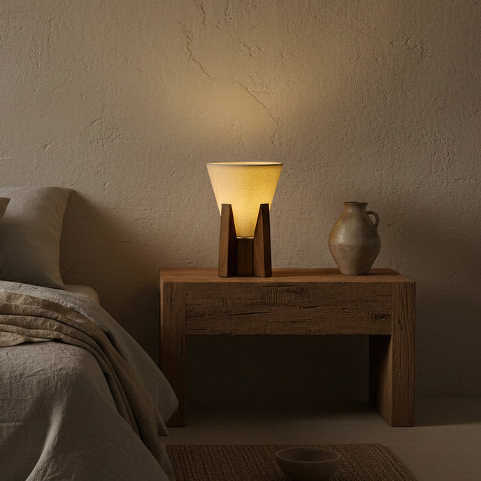 The Toro Table Lamp by Mooijane combines warm oak wood, vintage gold accents, and a refined conical lampshade, resulting in a look that is both modern and classic. Its cylindrical metal base is complemented by a medium-toned oak base, giving the design a natural texture and warm feel. Above, the inverted fabric lampshade features a diffuser at the top, softening the light and creating a tranquil and inviting atmosphere.