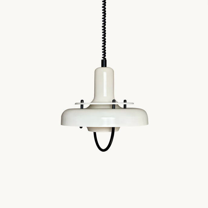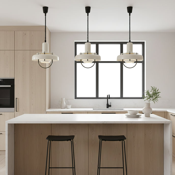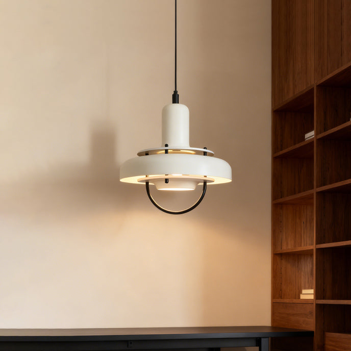 The Toscot Pendant Lamp from Mooijane delivers a clean, modern look through its lightweight aluminum construction and crisp geometric lines. The rounded shade is perfectly balanced in proportion, while the exposed metal frame introduces a subtle industrial edge. Soft, downward lighting filters through the layered structure, making the design both functional and visually striking.