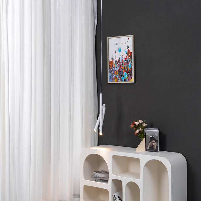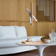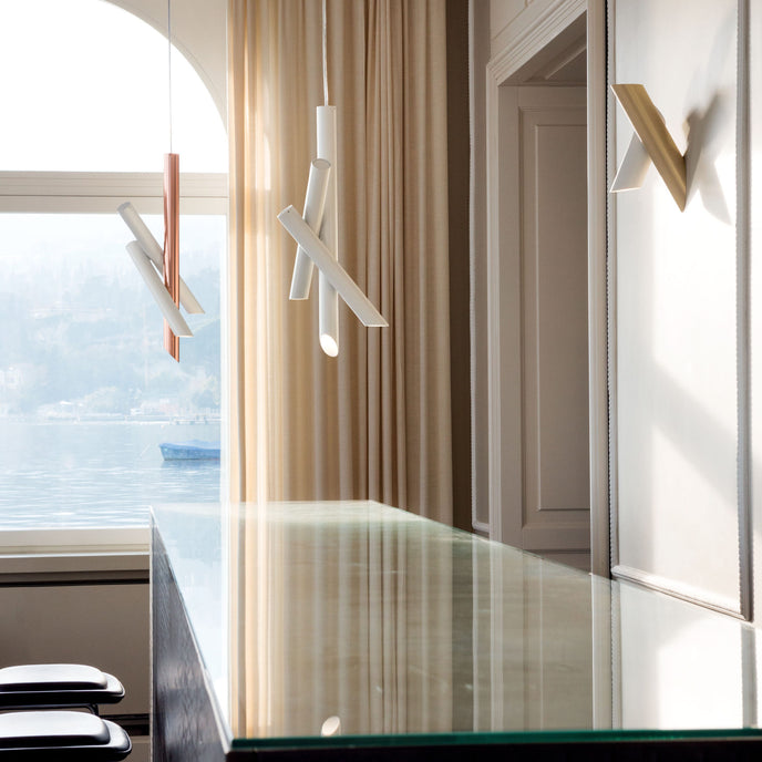 Family of suspension, wall, and ceiling lamps, made with tubular elements for objects with a strong and essential design that is expressed through pure forms. The wall versions are extruded aluminum rotatable and adjustable and are also available with a push dimmer installed directly on the lamp (Tubes 1/2). In the ceiling version, the ceiling element rotates at 340 °, while the other cylinder can be rotated by 90 °.
