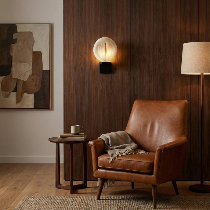 The Alice Alabaster Wall Lamp from Mooijane features a simple and elegant design, combining modern minimalism with natural grace. A matte black base supports the white alabaster lampshade, adorned with delicate natural textures, creating a refined and elegant artistic atmosphere on the wall. Warm light gently emanates from the central opening, casting a soft and romantic glow while avoiding harsh glare.