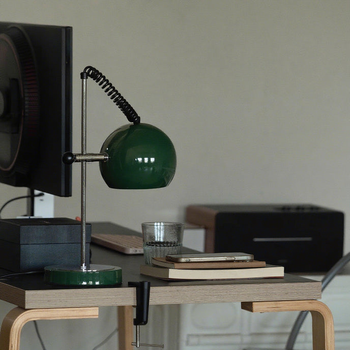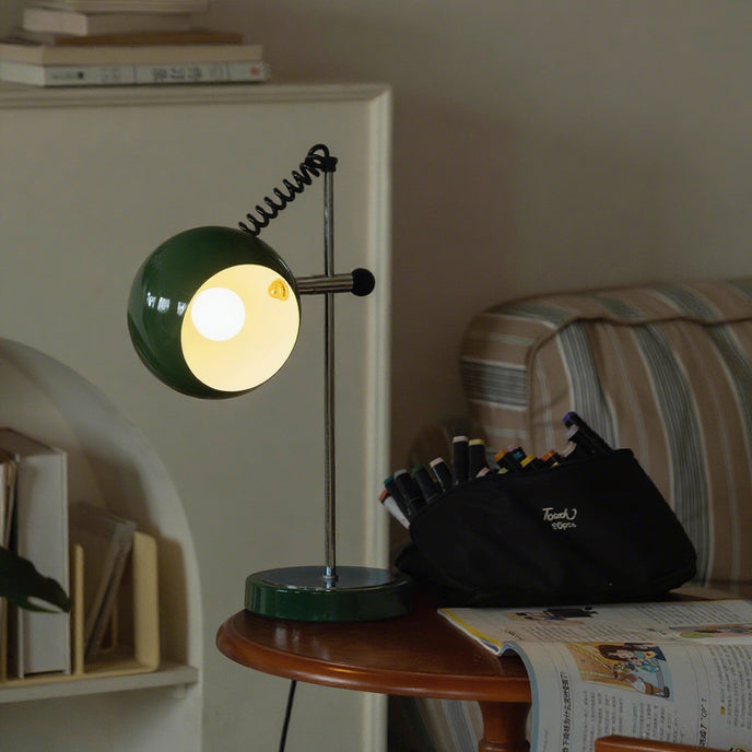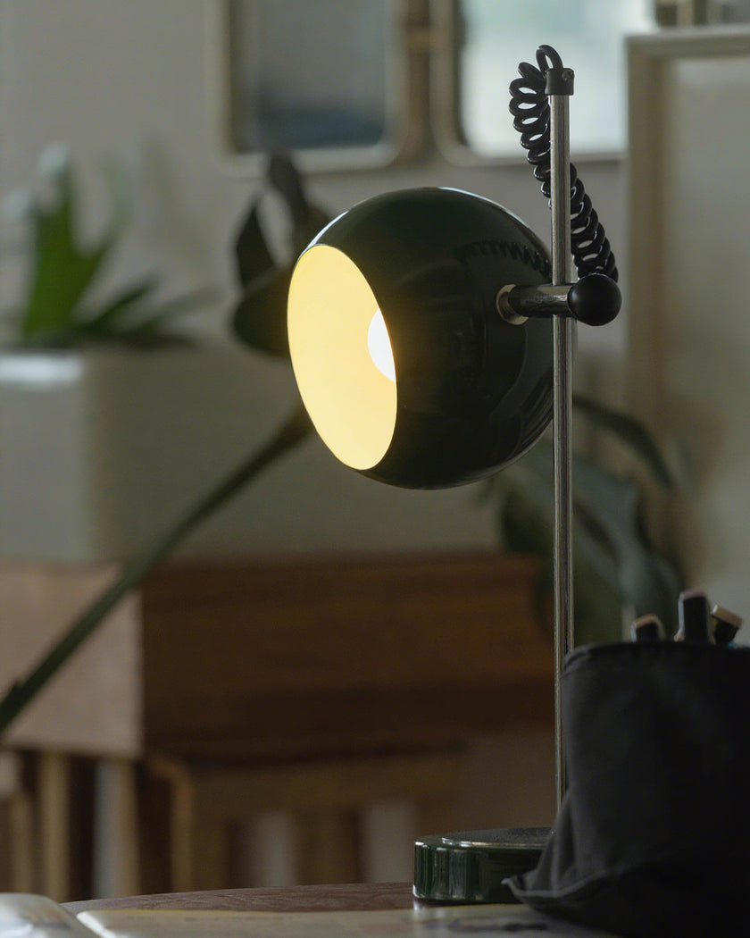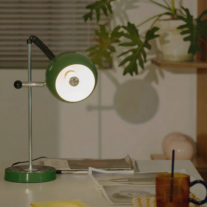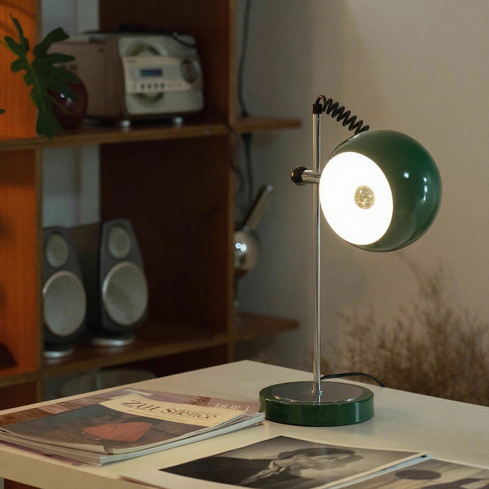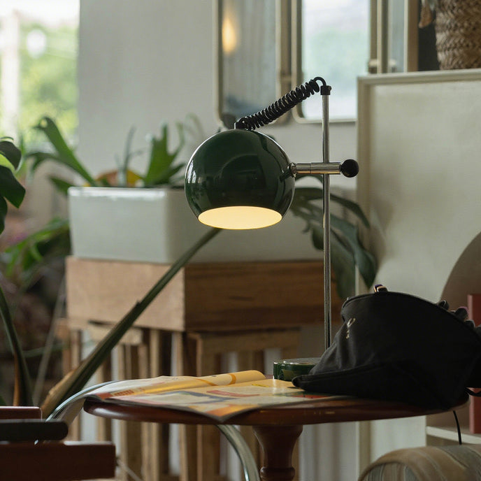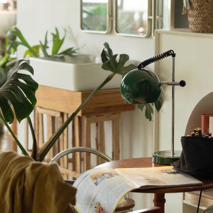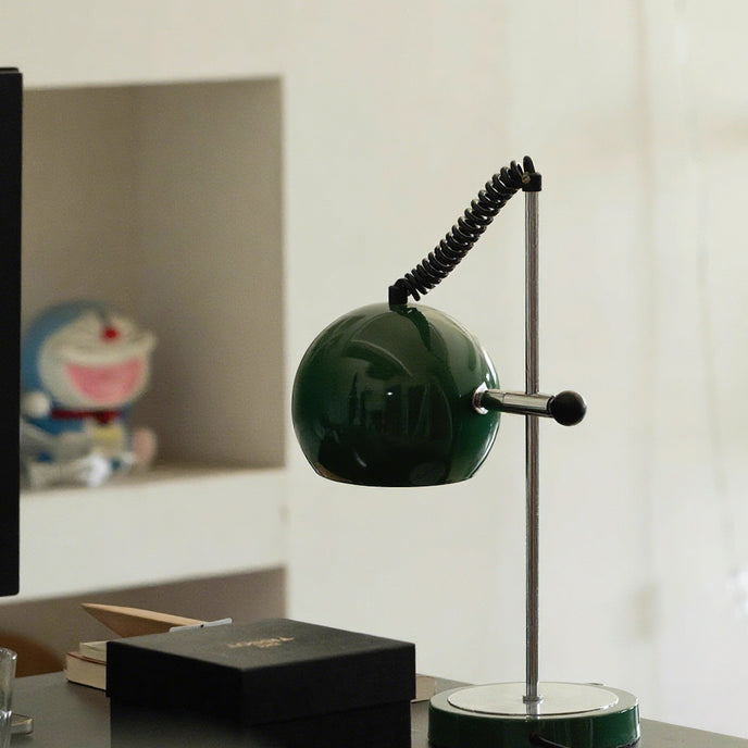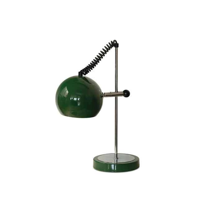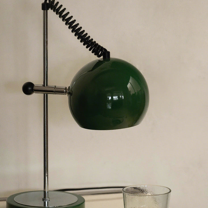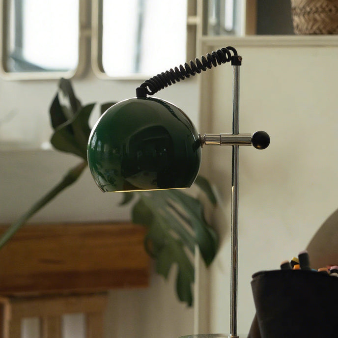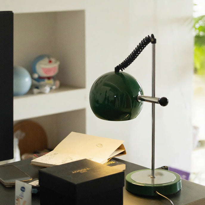 The Austria Table Lamp by Mooijane blends modern functionality with retro flair. Its distinctive spherical shade in deep green metal offers a bold, textured look, complemented by a lustrous metal stand and base for a sleek, sturdy structure. An adjustable arm and spiral cord add an industrial touch, enhancing both style and practicality. Perfect as a desk lamp or a decorative accent in the living room, it infuses any space with sophistication and unique character.