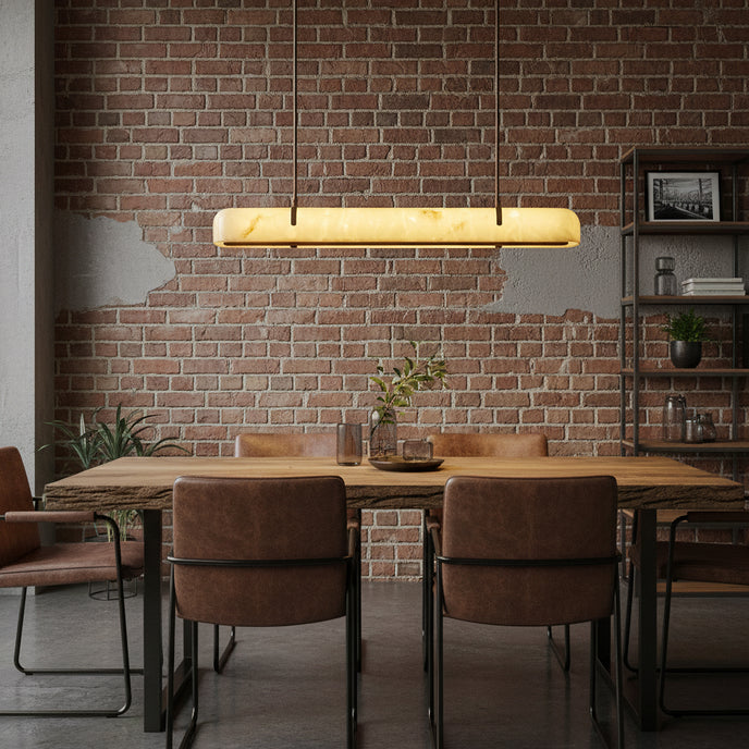 The Deleazo Pendant Lamp by Mooijane embodies minimalist elegance through a harmonious balance of form and material. Crafted from metal and simulated alabaster, its surface reveals a soft, natural texture that evokes the beauty of stone. A warm, diffused glow radiates from within, creating an atmosphere of calm sophistication. Supported by a brushed metal stem, this pendant lamp adds a touch of understated luxury to dining rooms, kitchen islands, and modern living spaces.