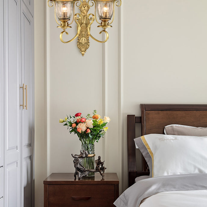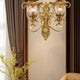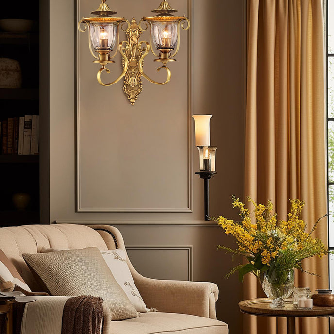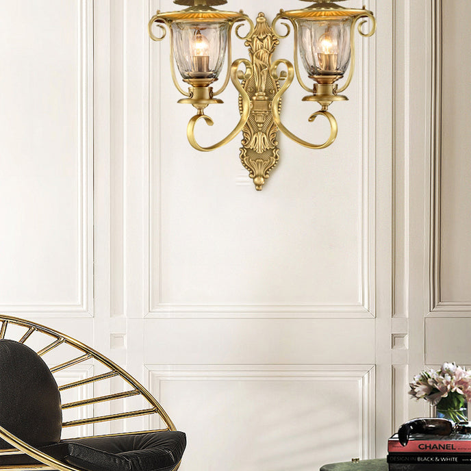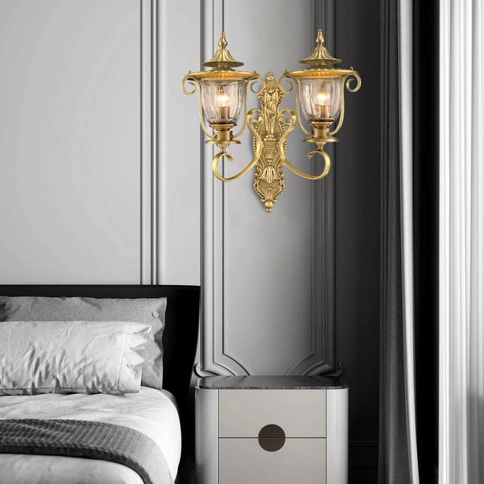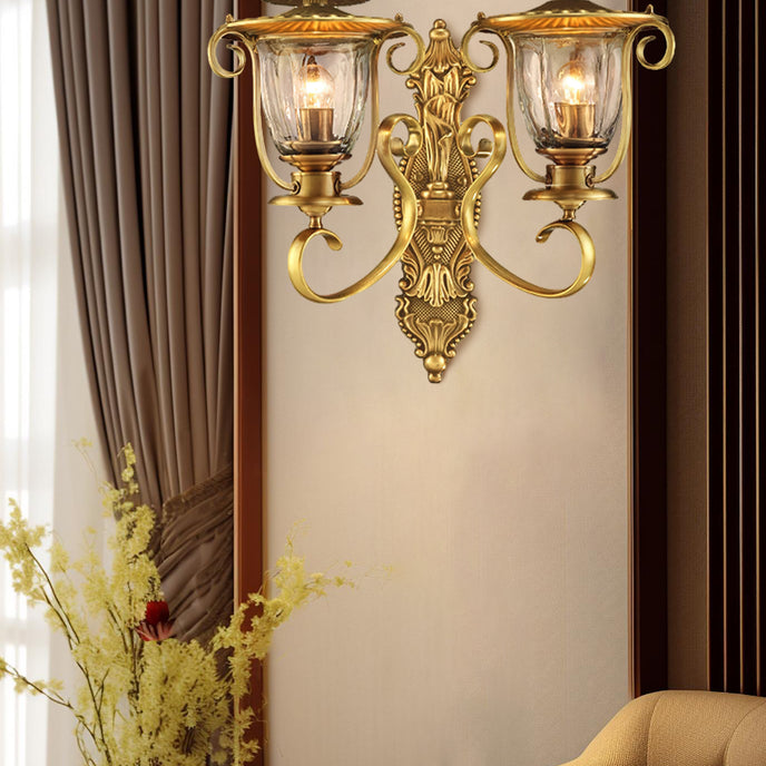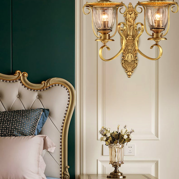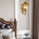 This ornate European Style Palace Brass Wall Lamp exudes a timeless sophistication. Boasting a striking brass finish, this lamp gracefully illuminates any room with its majestic ambience, creating a grand, luxurious atmosphere.
