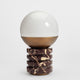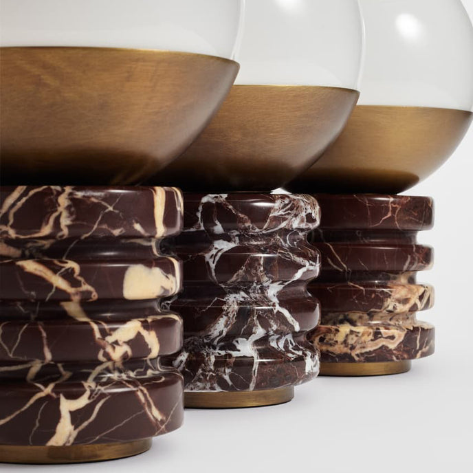 Elevate your home decor with the Evolet Table Lamp from Mooijane. Crafted from exquisite dark red marble, the cylindrical base features a unique natural texture, making each piece a one-of-a-kind work of art. The white glass shade, combined with the vintage brass frame, softly diffuses light, creating a warm and inviting atmosphere. Whether placed on a desk, side table, or coffee table, this lamp seamlessly blends into any space, showcasing timeless elegance and classic beauty.