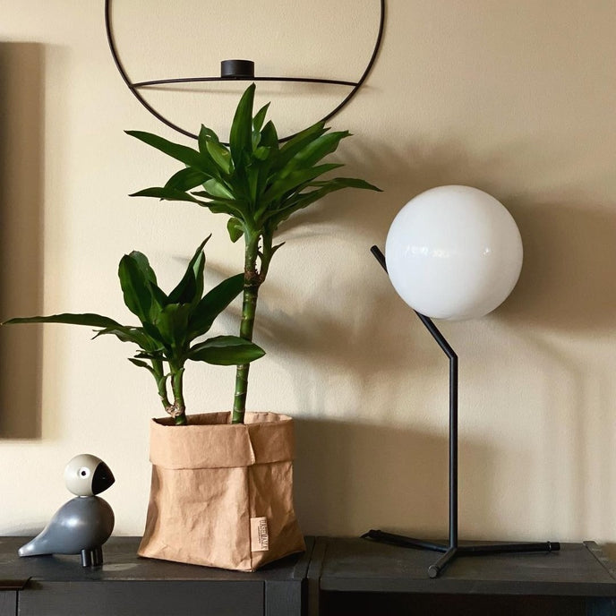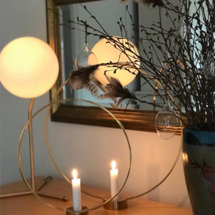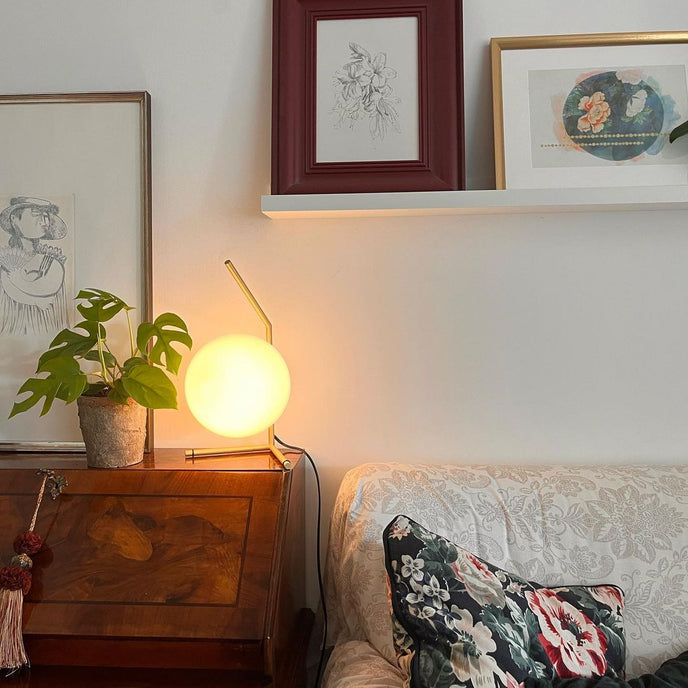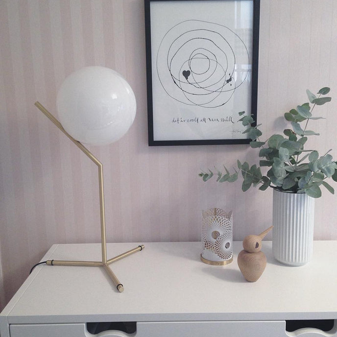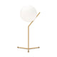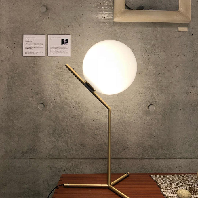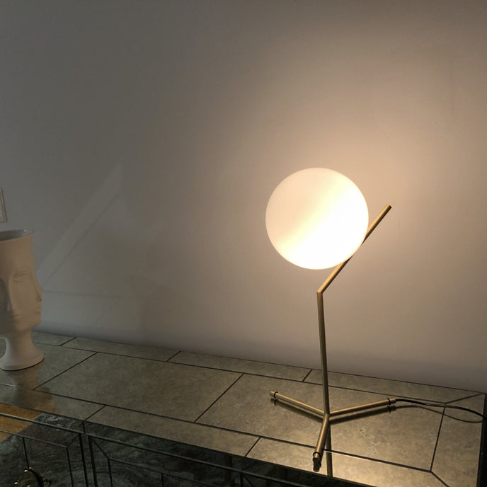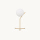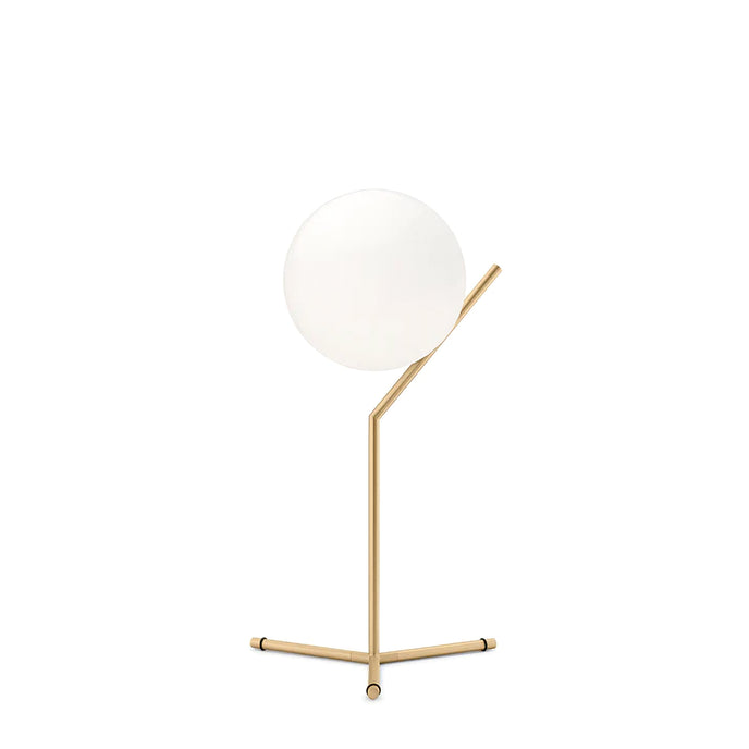 A mesa IC Lights de designer renomado consiste em uma base de latão que torce e dobra em um ângulo. A partir daí, uma orbe branca de vidro soprado se equilibra delicadamente. O candeeiro de mesa, que emite luz difusa. IC Lights T agora está disponível em um novo acabamento em latão que adiciona dimensão à impressionante coleção de designs enganosamente simples.